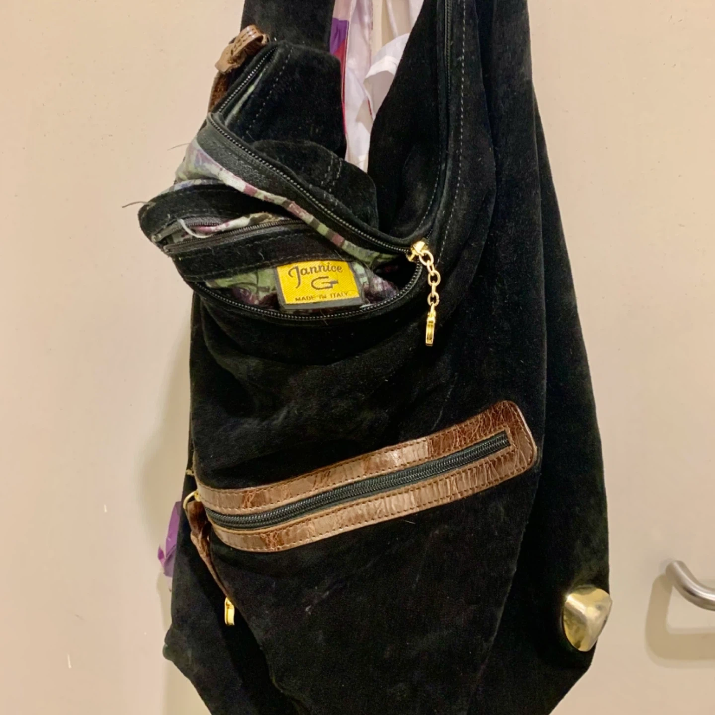 Stylish Jannice hobo bag made from soft black suede. It features a front zippered pocket with leather trim and gold-tone hardware. This bag is perfect for everyday use!