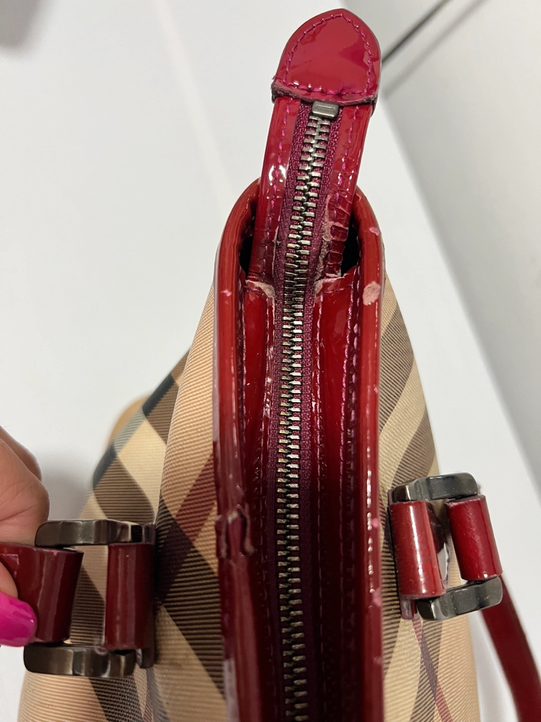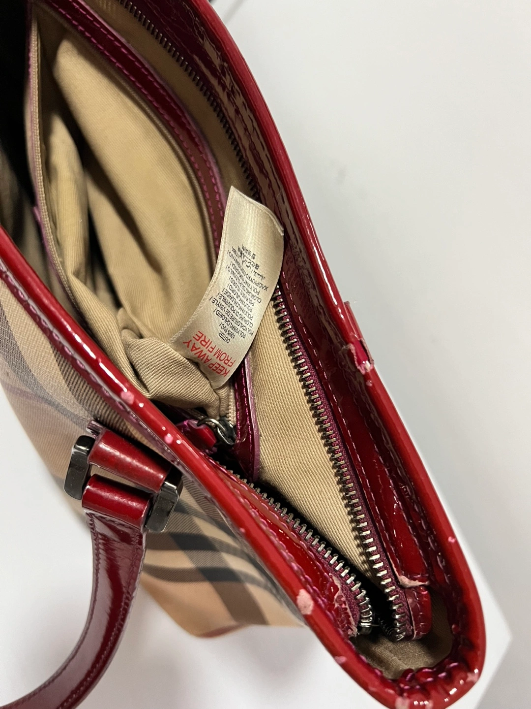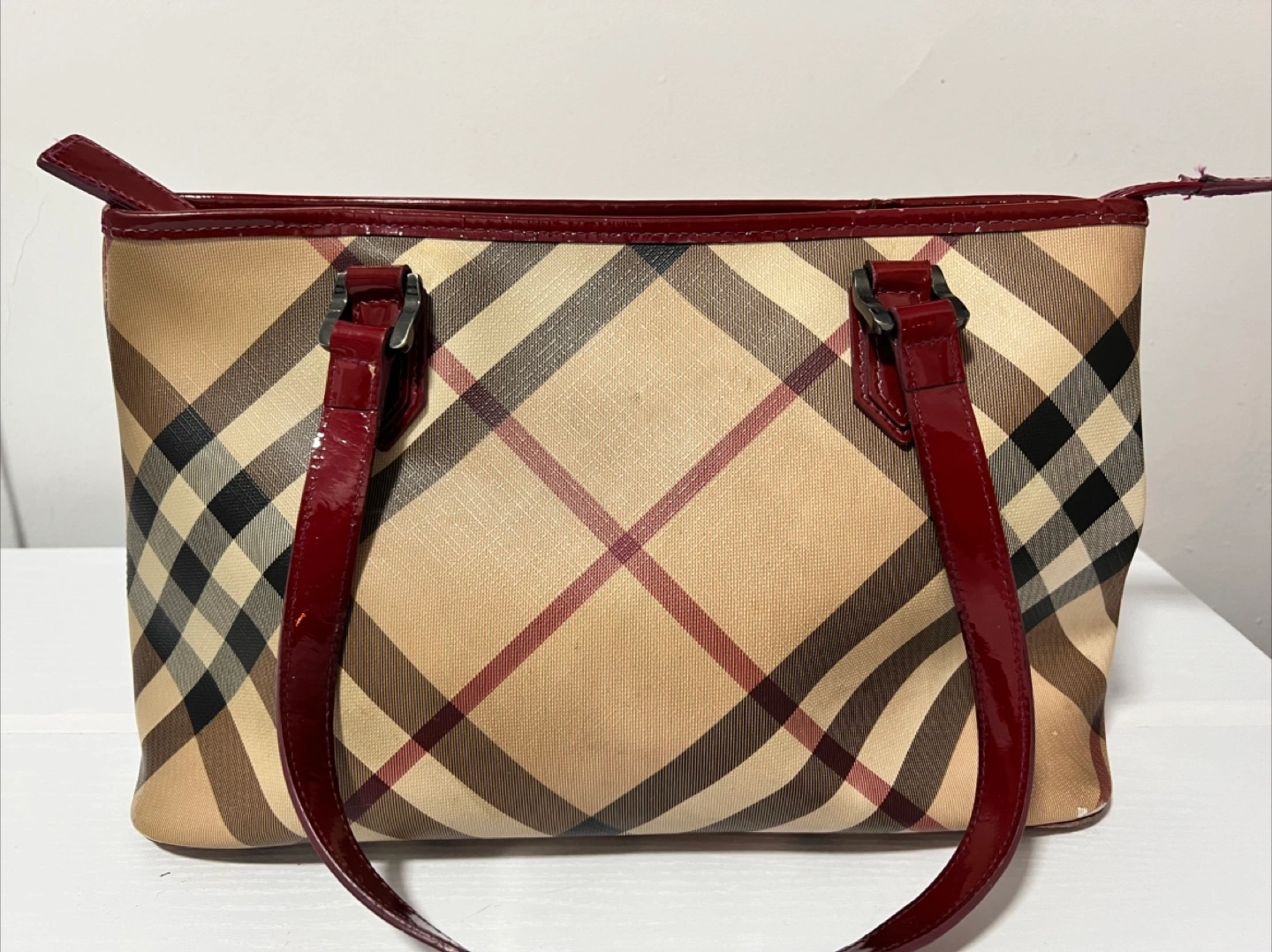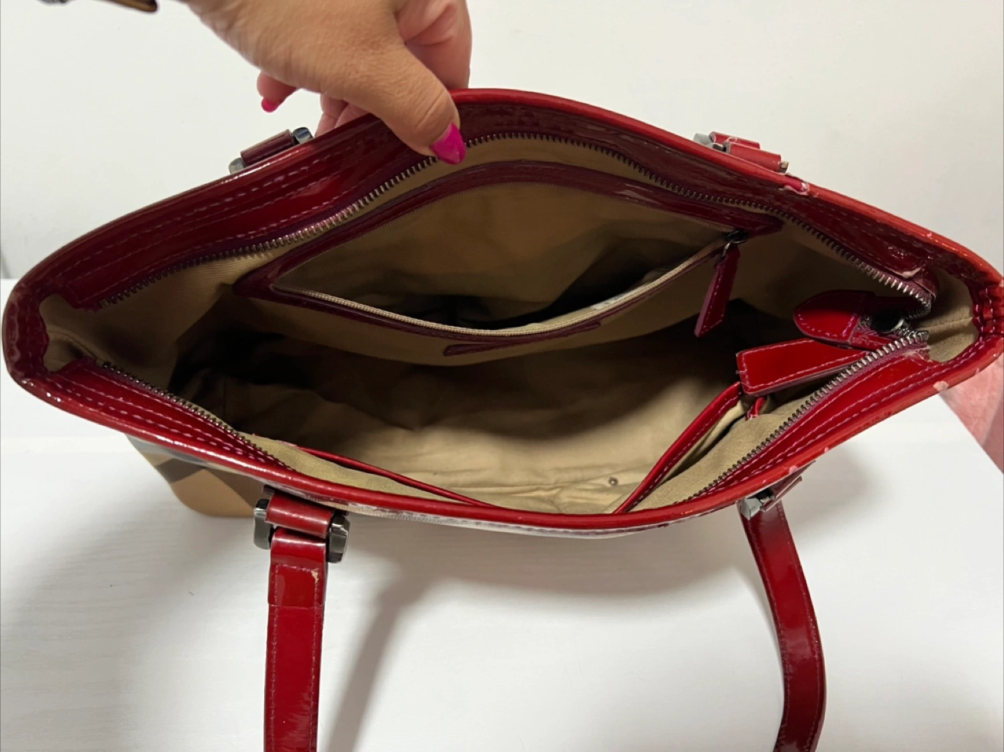 Selling a Burberry tote bag with the classic Burberry plaid pattern and red patent leather handles. It's in good condition and ready for a new home! Perfect for everyday use