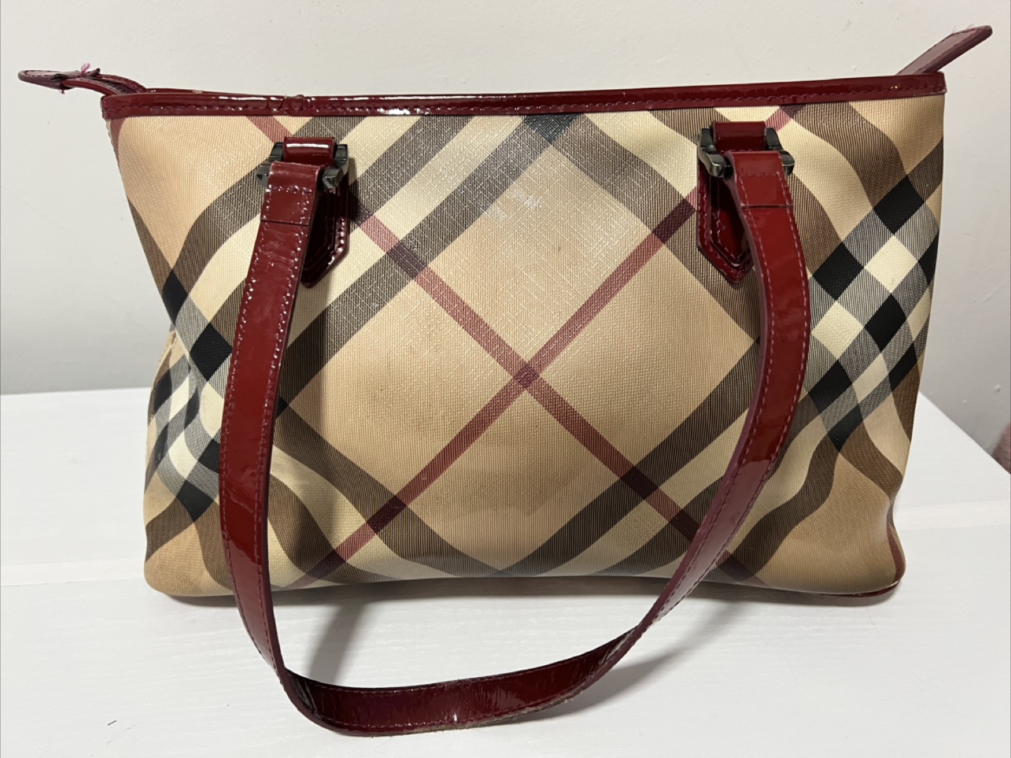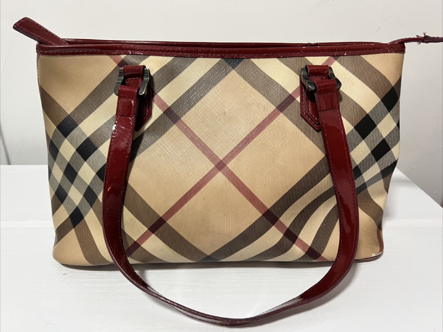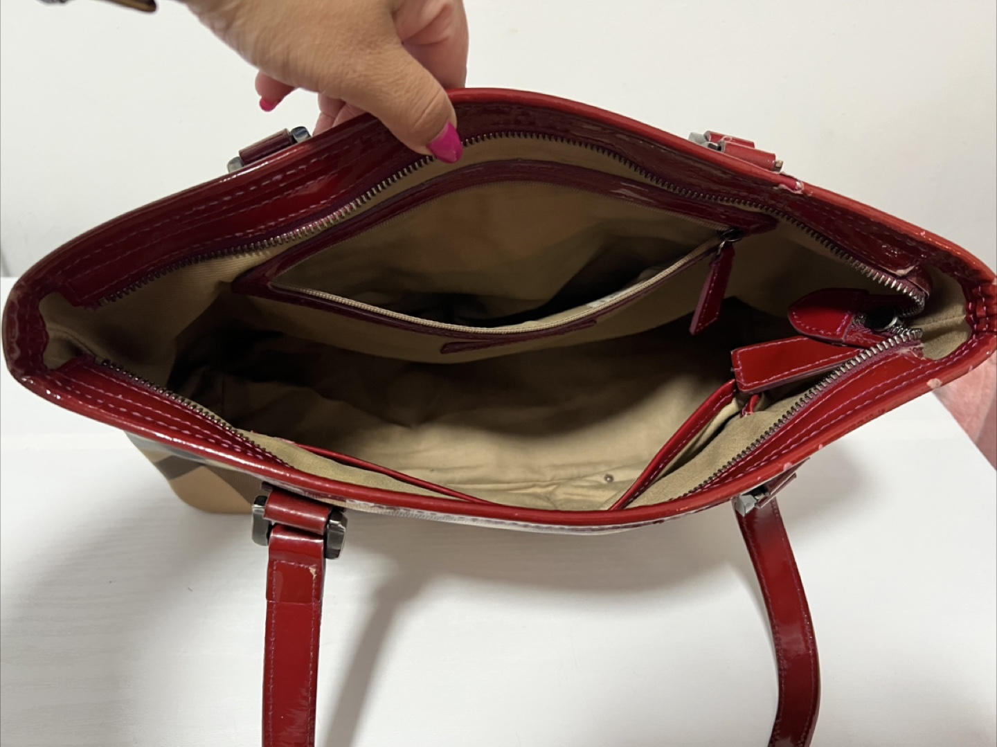 Selling a Burberry tote bag with the classic Burberry plaid pattern and red patent leather handles. It's in good condition and ready for a new home! Perfect for everyday use