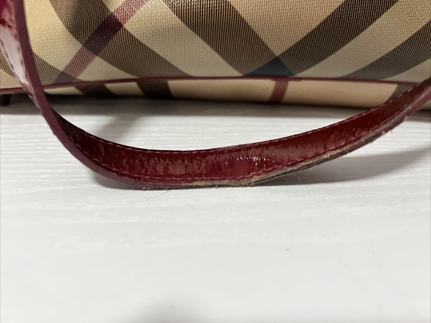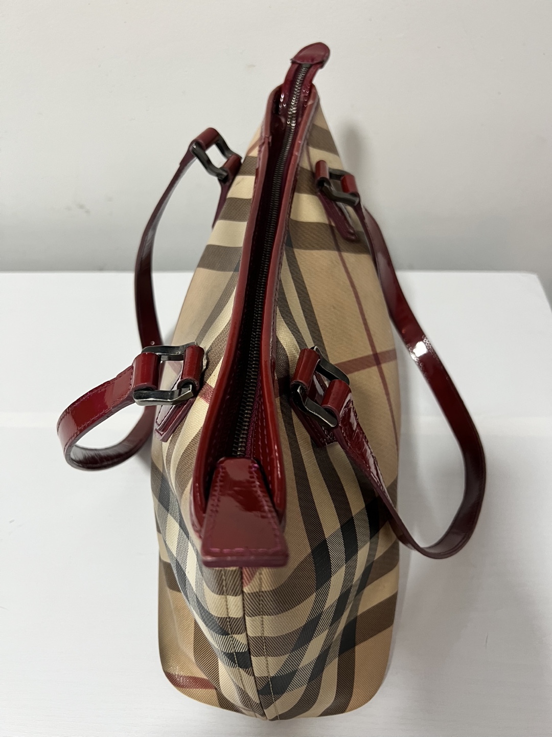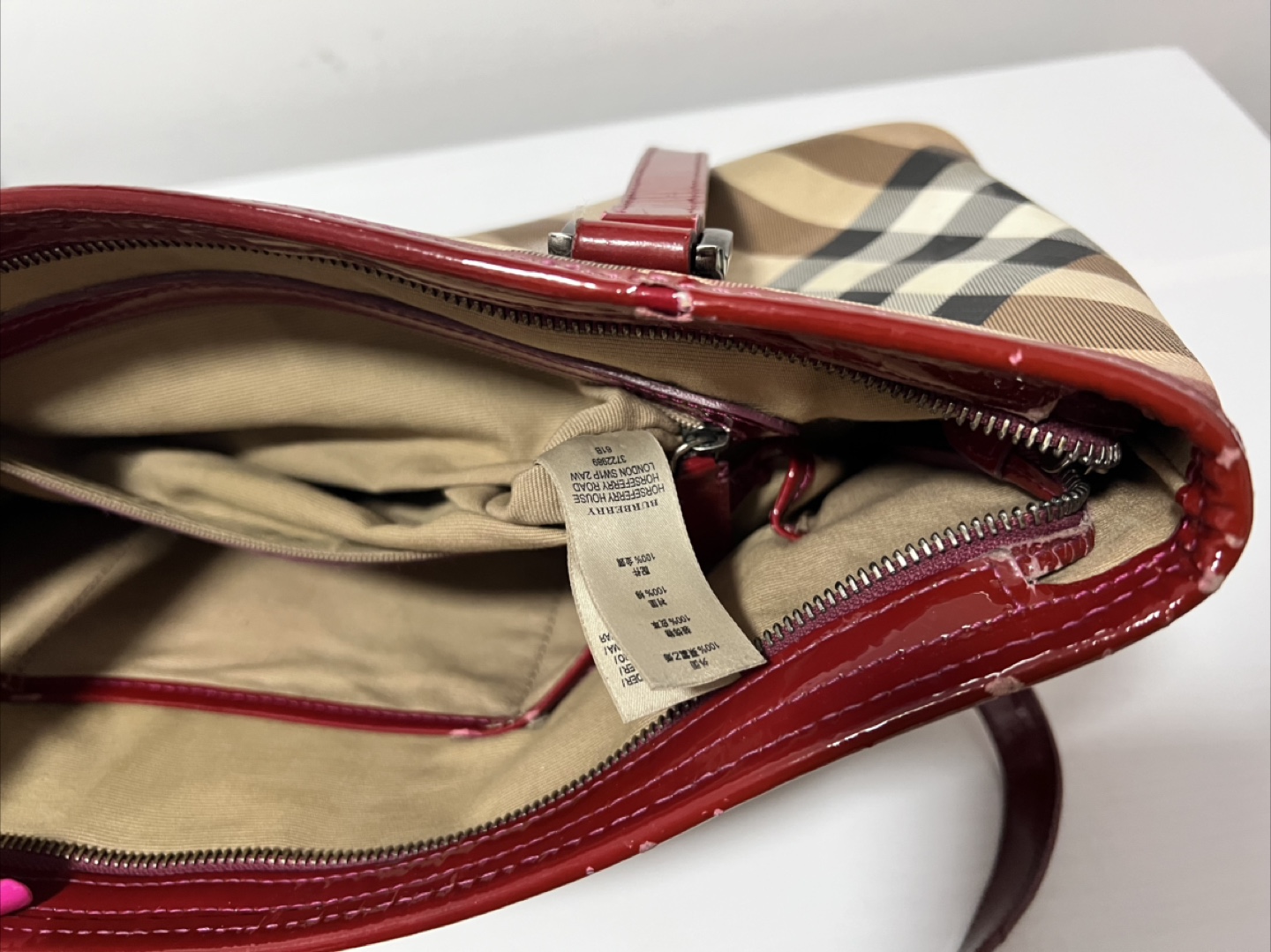 Selling a Burberry tote bag with the classic Burberry plaid pattern and red patent leather handles. It's in good condition and ready for a new home! Perfect for everyday use