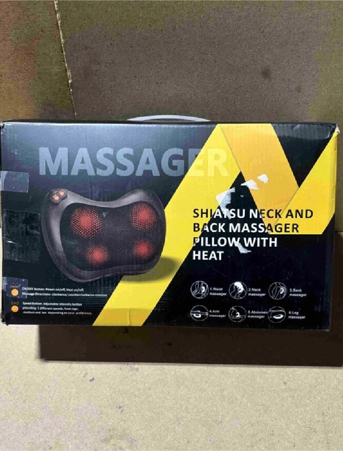 This is an iKristin shiatsu neck and back massager pillow. It features deep kneading massage with heat. It can be used on the neck, back, shoulder, leg, foot, and whole body. Includes original box and power adapter.