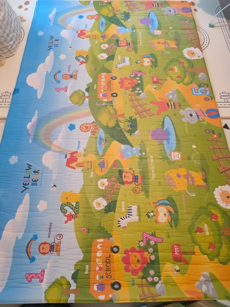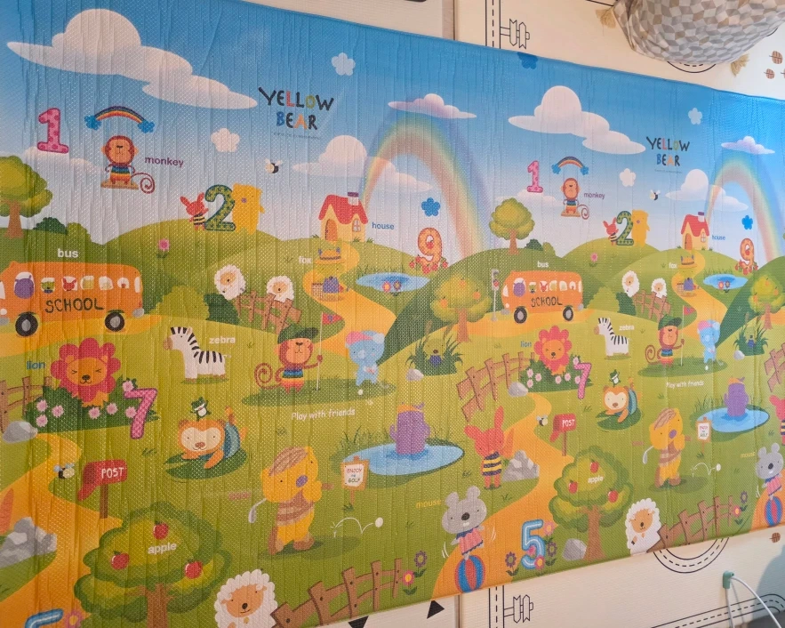 Selling a colourful kids’ play mat! It has soft cushioning, perfect for babies and children to play safely. The mat features bright animals, numbers, and everyday objects—great for early learning and playtime. It has a few ripped or worn spots, so I’m selling it at a great price. I stored it rolled up, so there are some wrinkles right now, but they will flatten out once it ’s laid out for a bit.