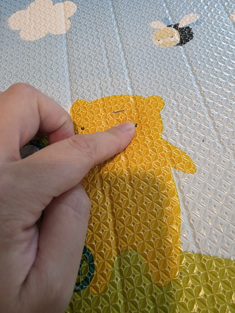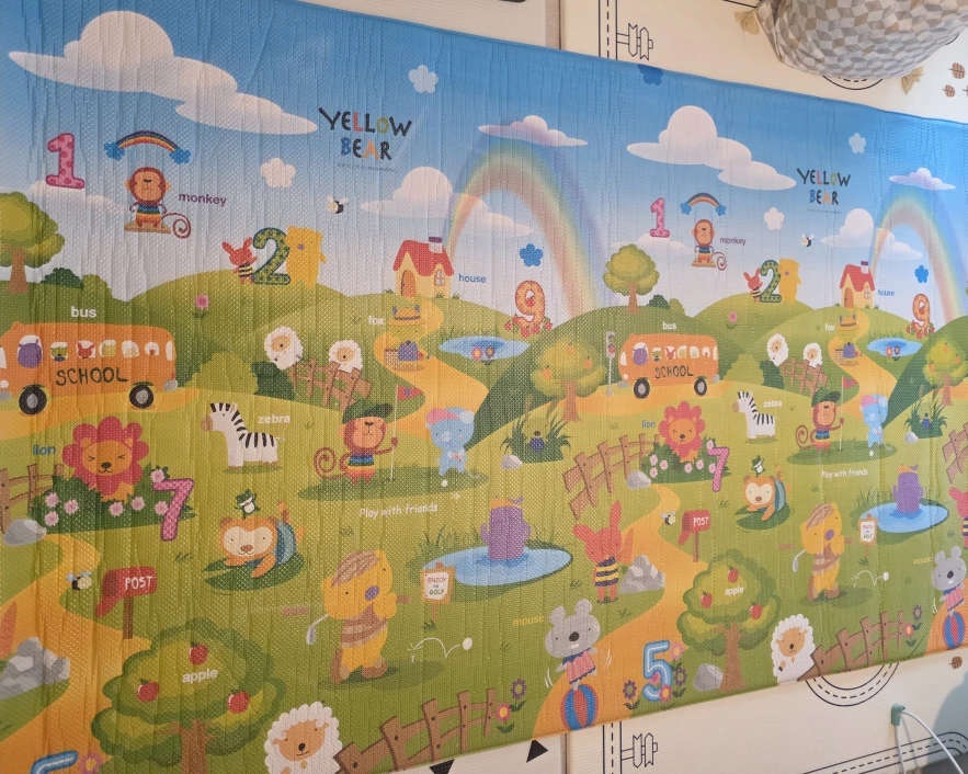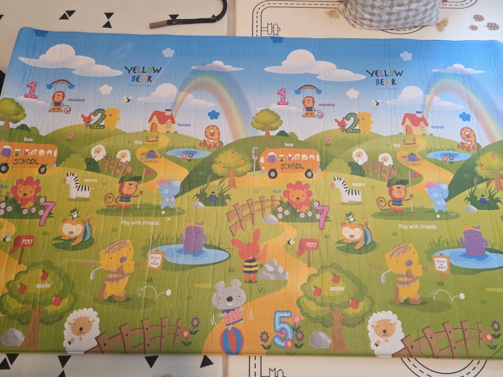 Selling a colourful kids’ play mat! It has soft cushioning, perfect for babies and children to play safely. The mat features bright animals, numbers, and everyday objects—great for early learning and playtime. It has a few ripped or worn spots, so I’m selling it at a great price. I stored it rolled up, so there are some wrinkles right now, but they will flatten out once it ’s laid out for a bit.