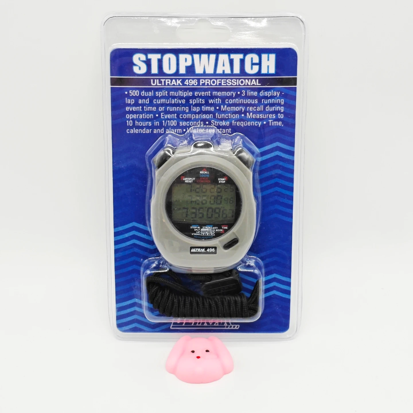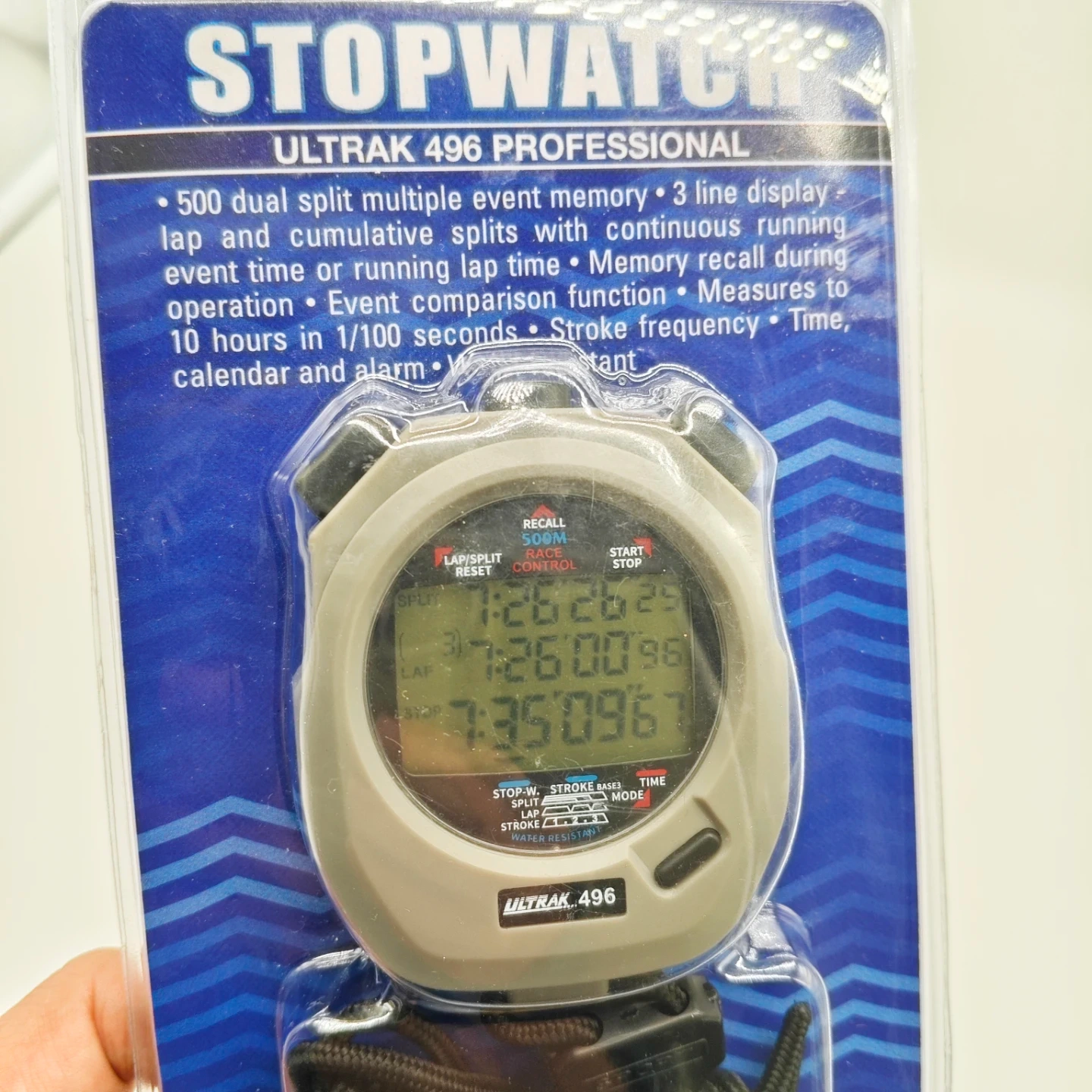 Selling a brand new Ultrak 496 Professional Stopwatch! This stopwatch has a 3 line display, lap and cumulative splits with continuous running event time or running lap time, memory recall during operation, event comparison function, measures to 10 hours in 1/100 seconds, stroke frequency, time, calendar and alarm