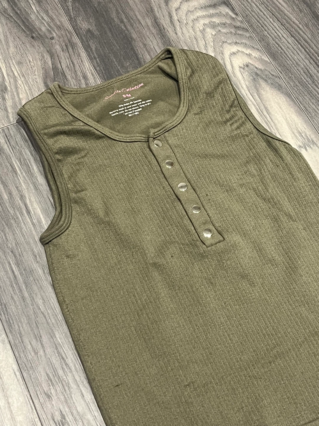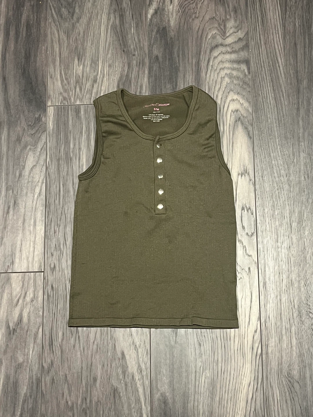 Olive green sleeveless henley tank top. Can be worn with buttons down or up. Perfect for layering or wearing on its own. Great summer top. No damage, like new.