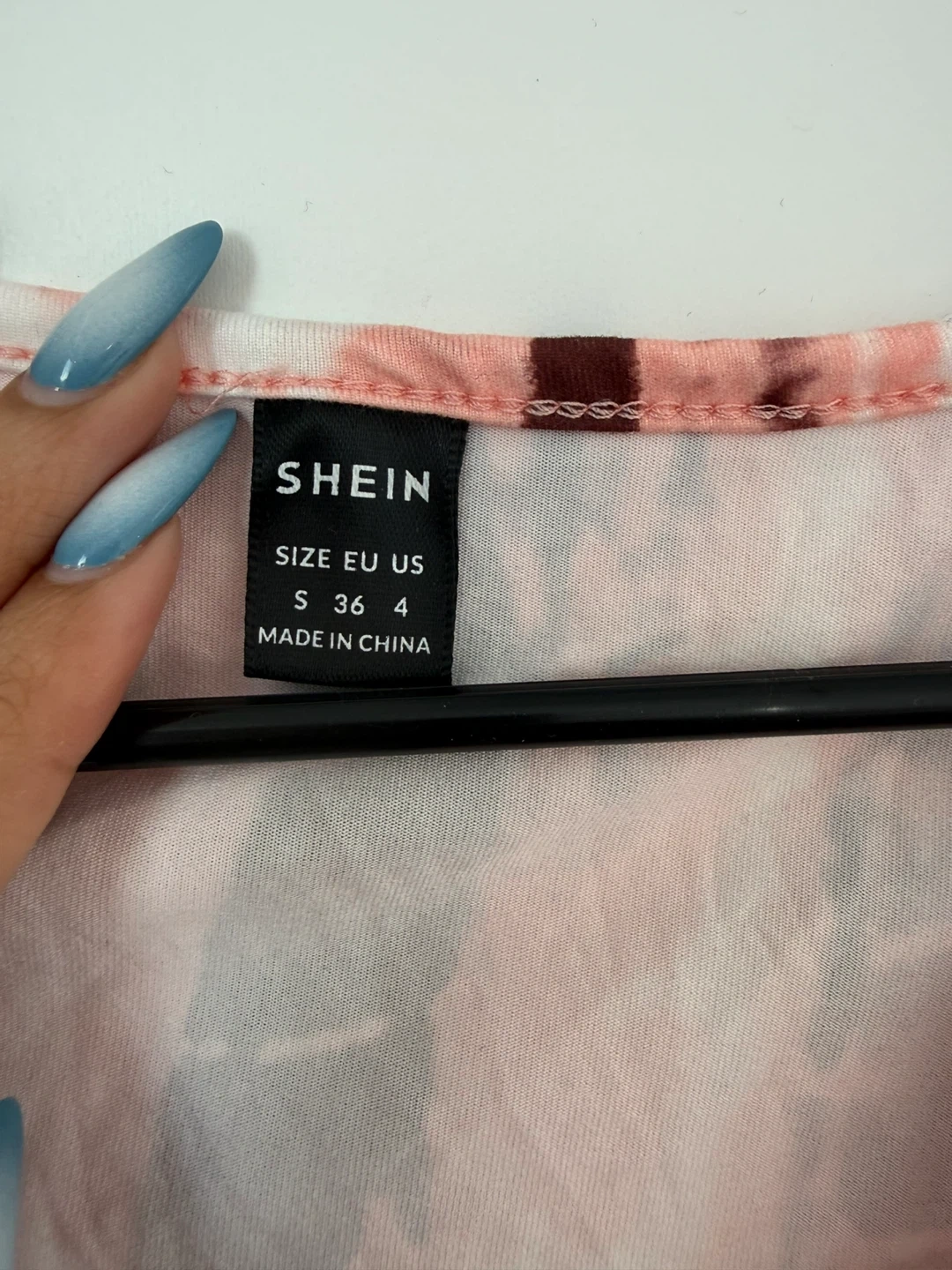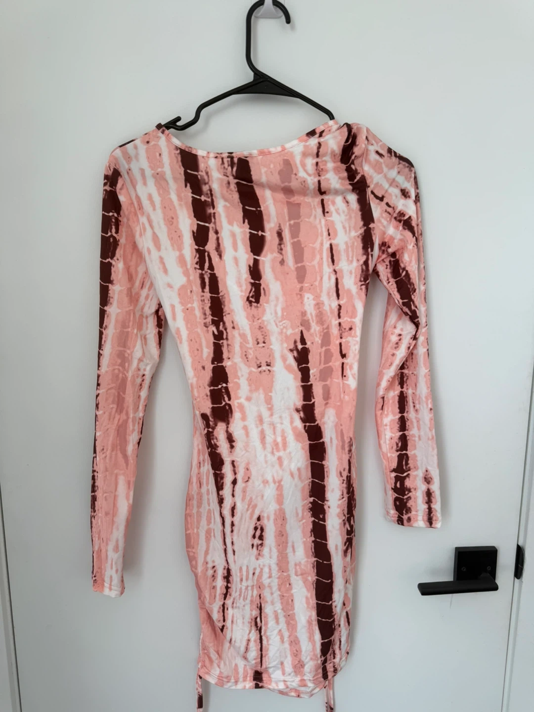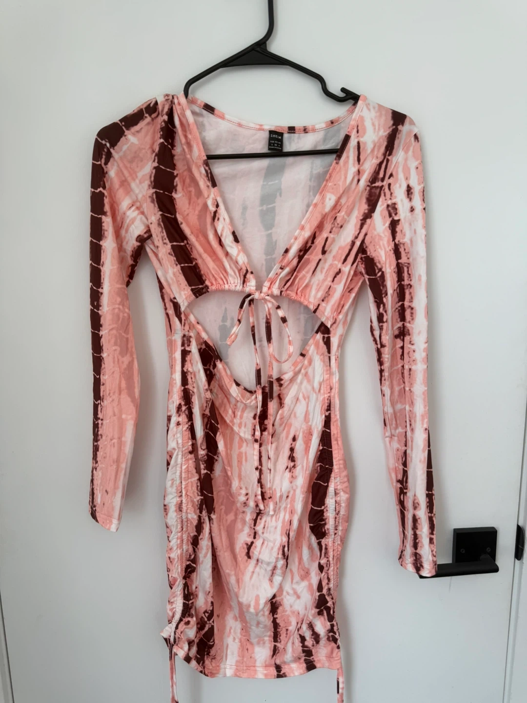 This is a SHEIN mini dress features a tie-dye pattern in pink and brown with long sleeves and a cutout detail at the front. You can ADJUST the length of the dress by the bottom strings!