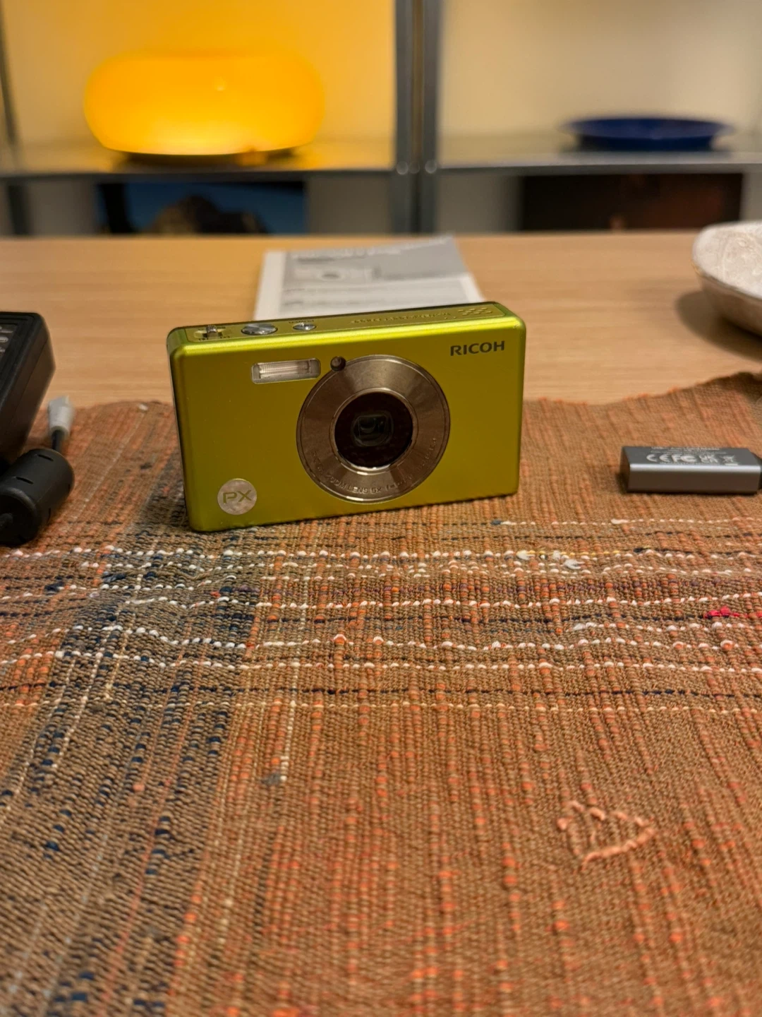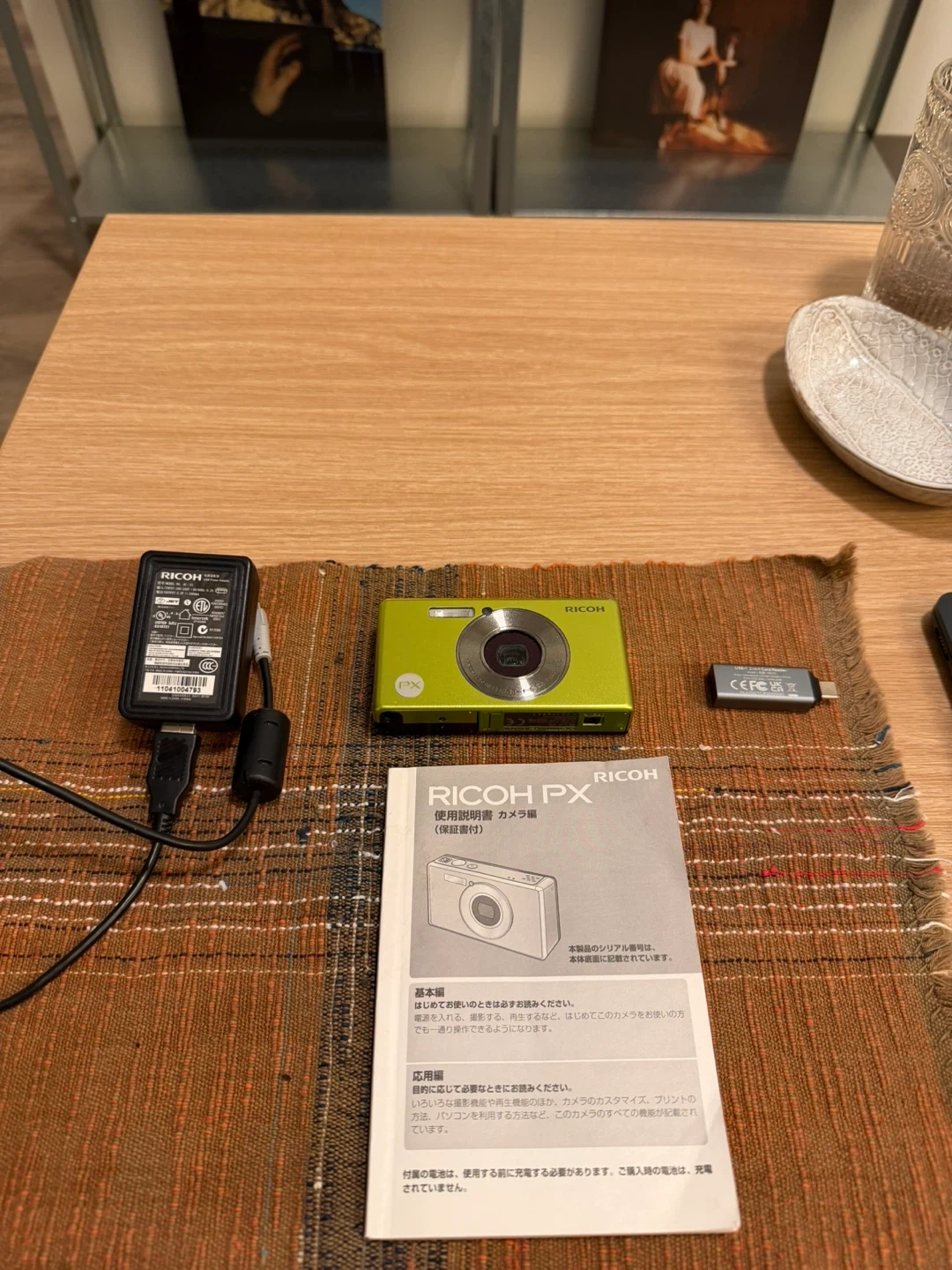 This is a Ricoh PX digital camera. It comes with a charger and manual. It's a compact camera for everyday shots.
