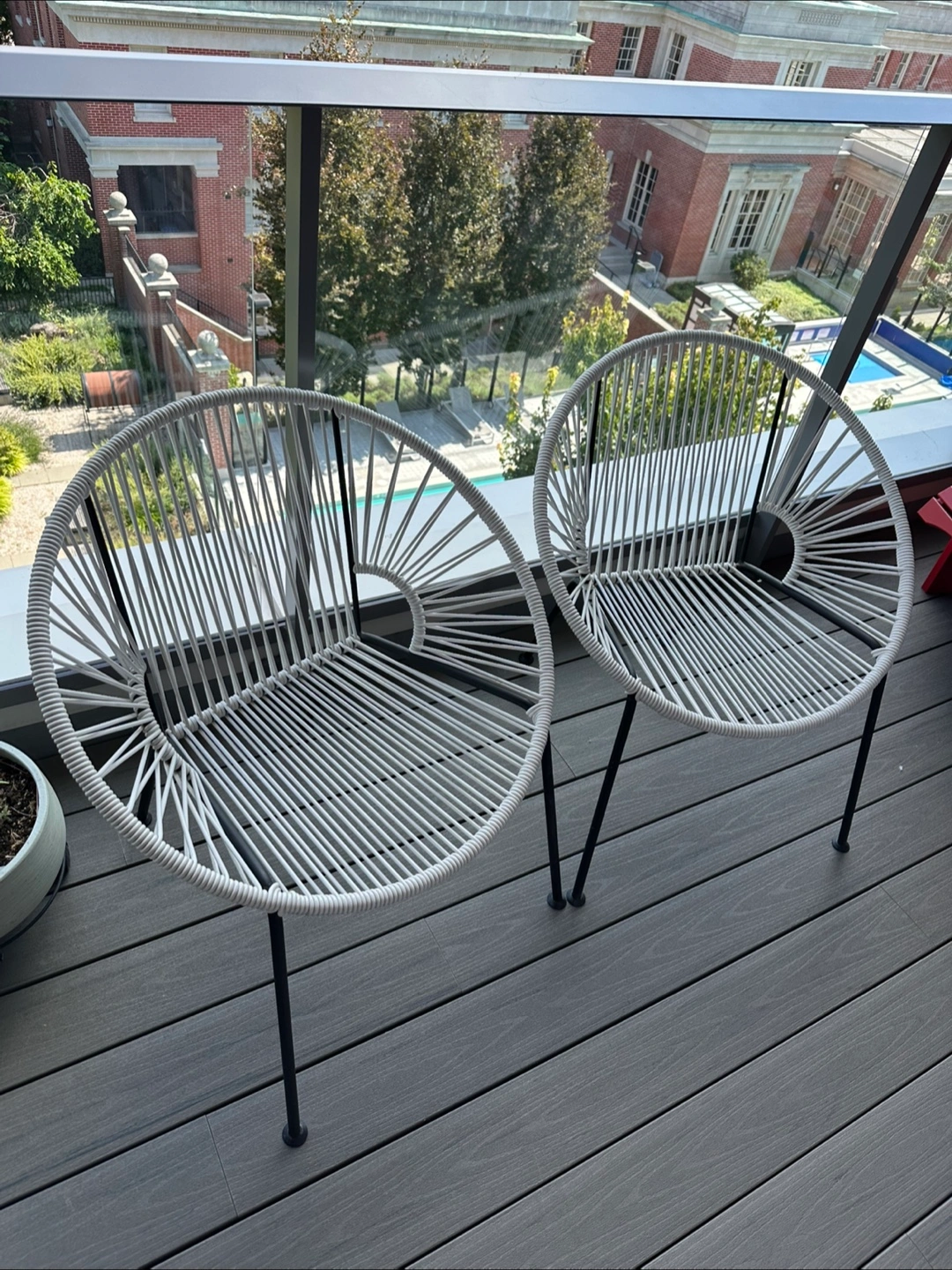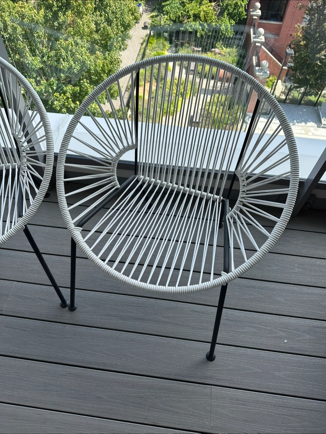 Selling a set of two outdoor chairs from CB2! They are white with black legs. Perfect for a balcony or patio.