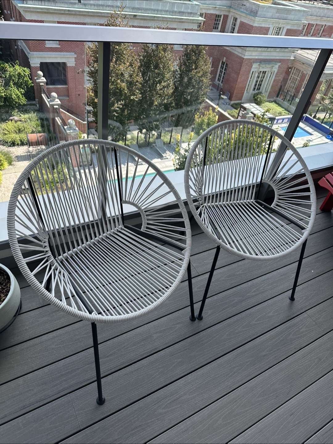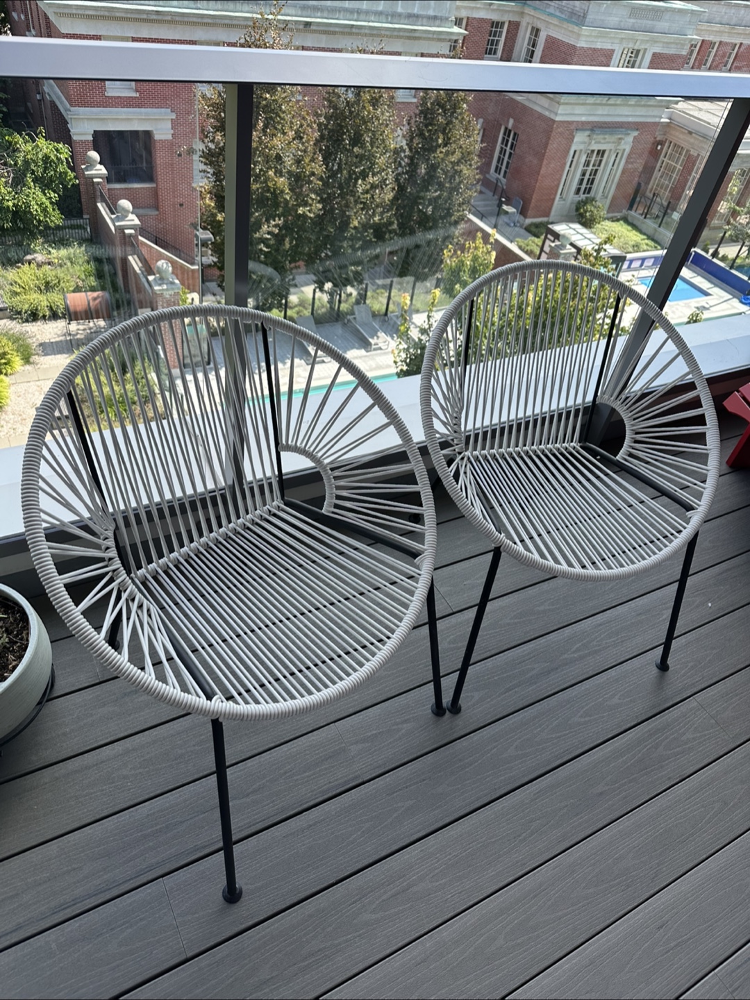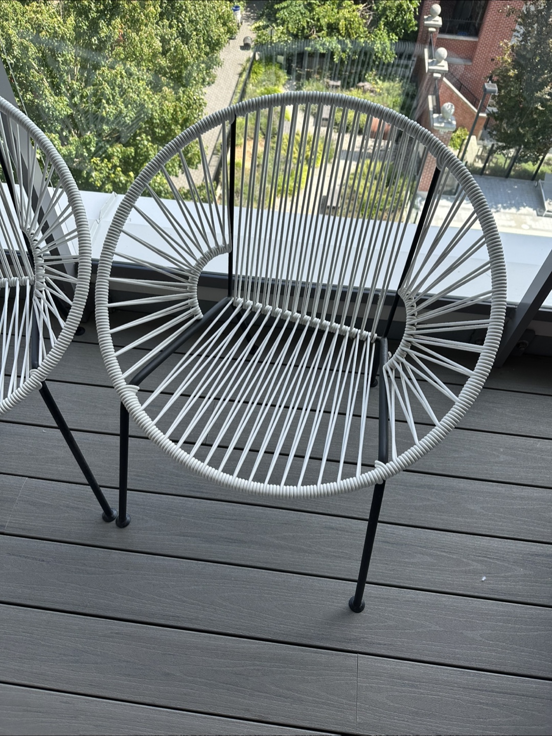 Selling a set of two outdoor chairs from CB2! They are white with black legs. Perfect for a balcony or patio.