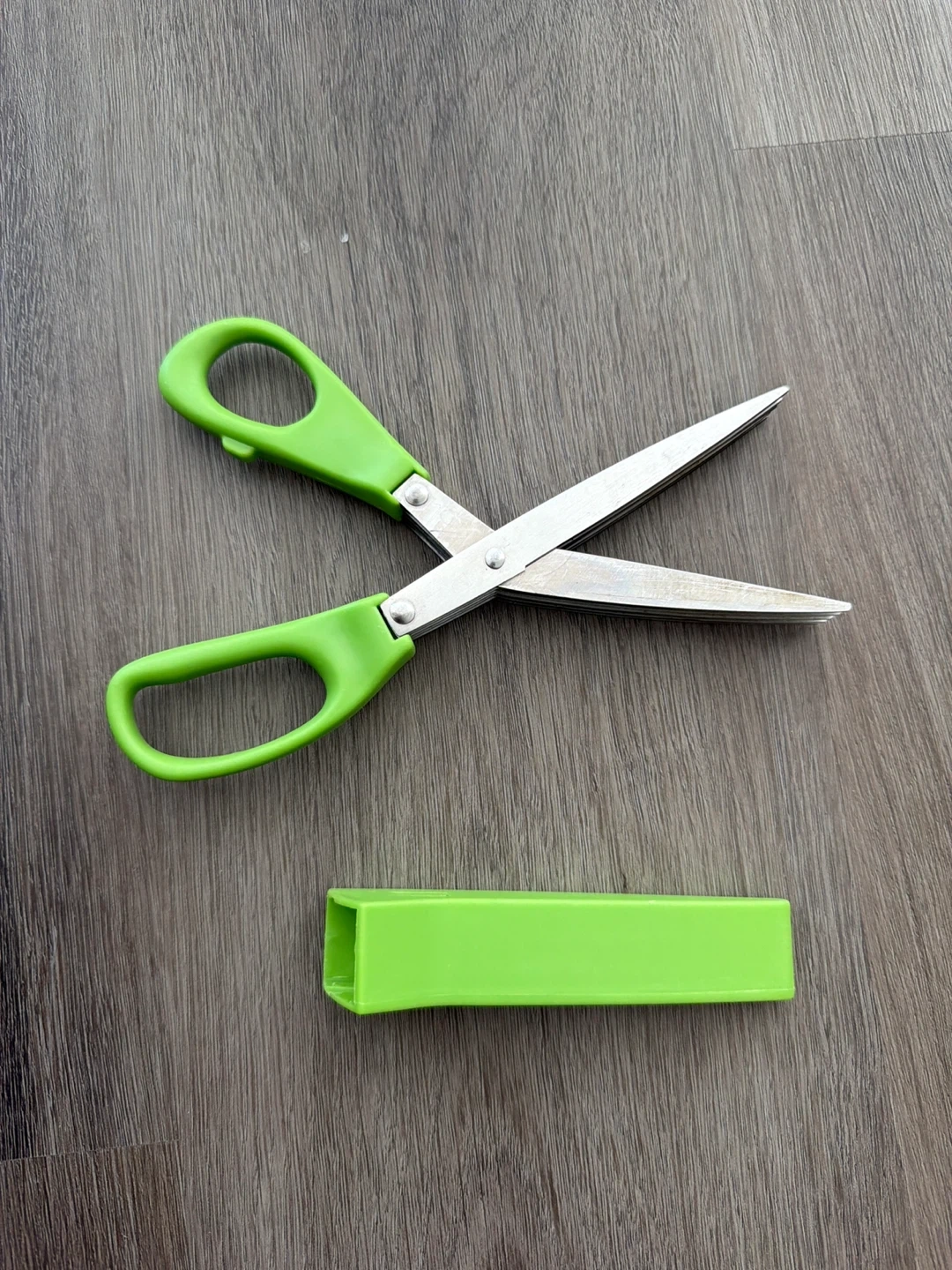 These herb scissors have a bright green handle and a stainless steel blades. A protective green cover is included to keep the blades safe.