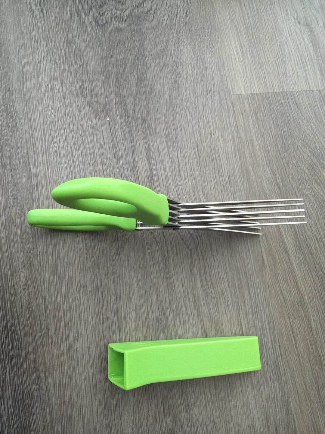 These herb scissors have a bright green handle and a stainless steel blades. A protective green cover is included to keep the blades safe.