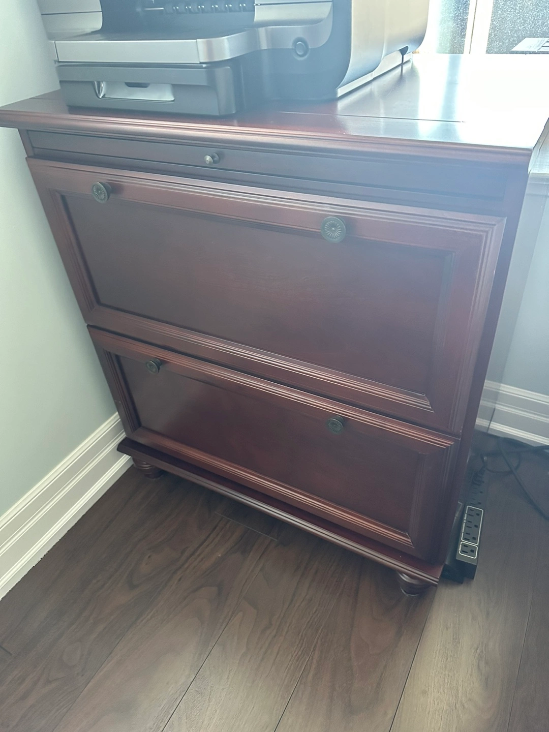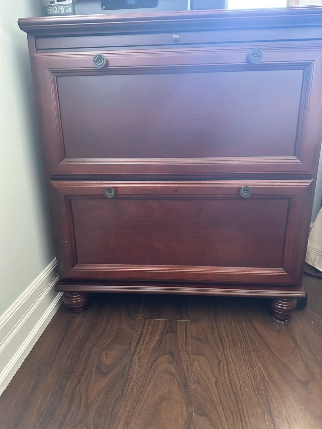 Matching lateral file cabinet. Cabinet features two legal file drawers. Great for home office or study.