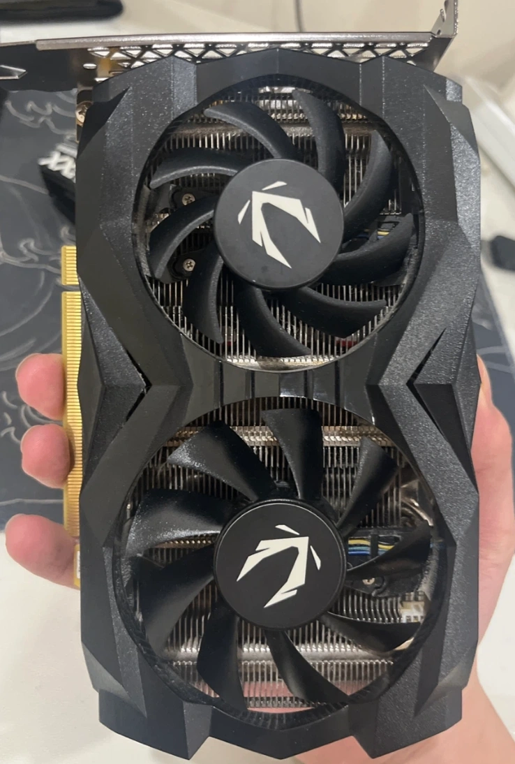 This ZOTAC GAMING GeForce GTX 1660 SUPER graphics card has a black and gold design. It features dual fans for cooling.