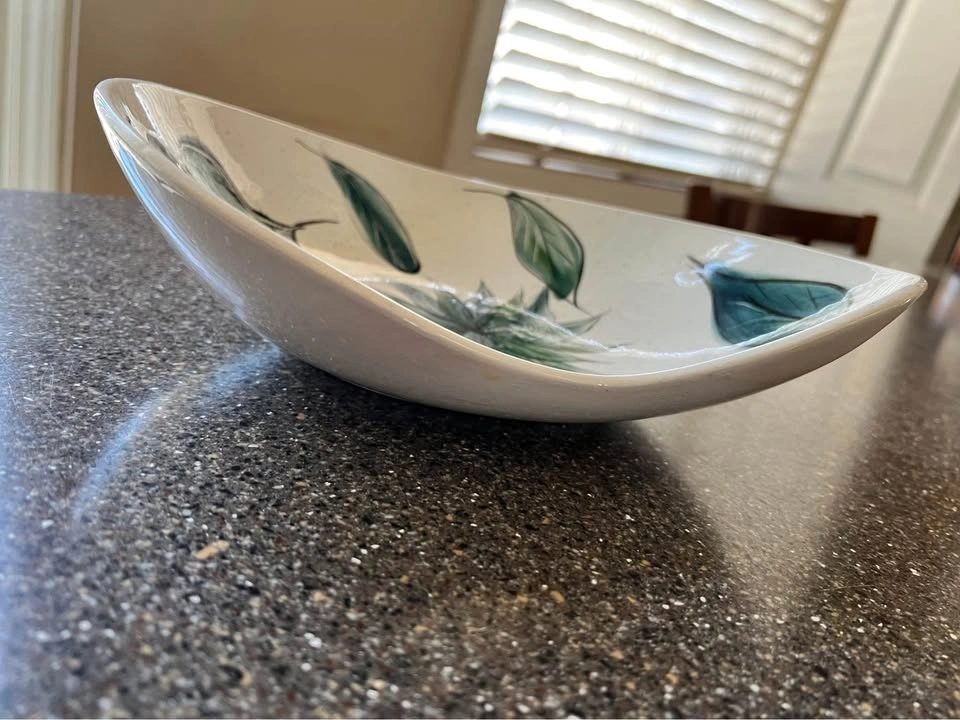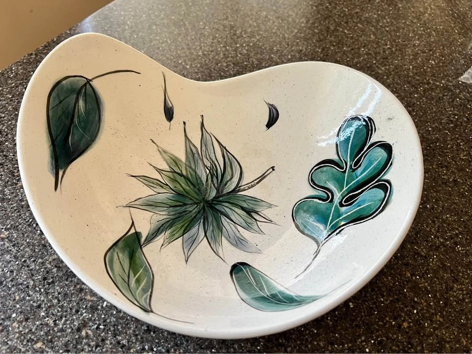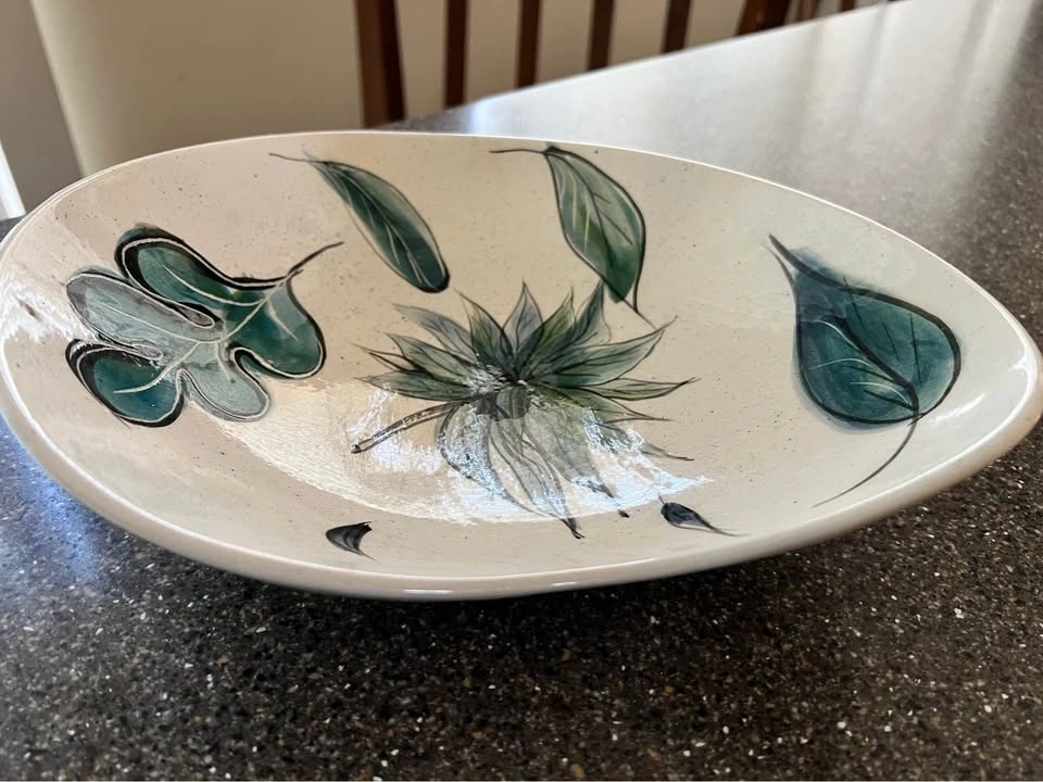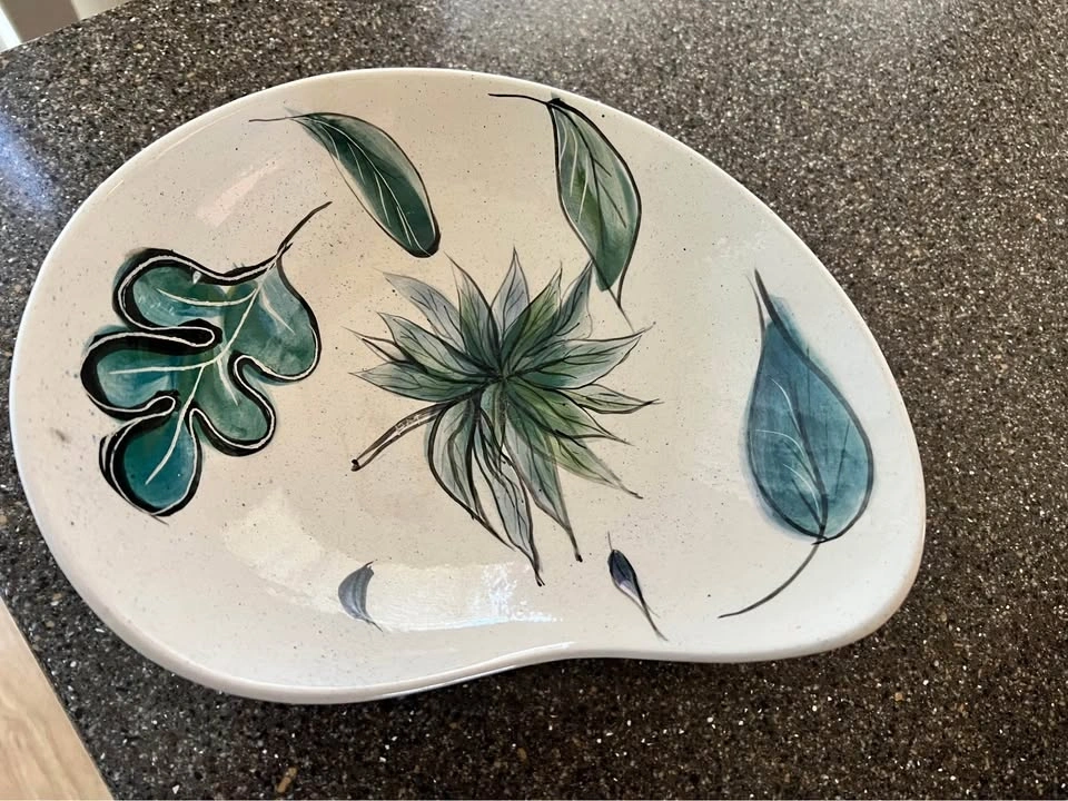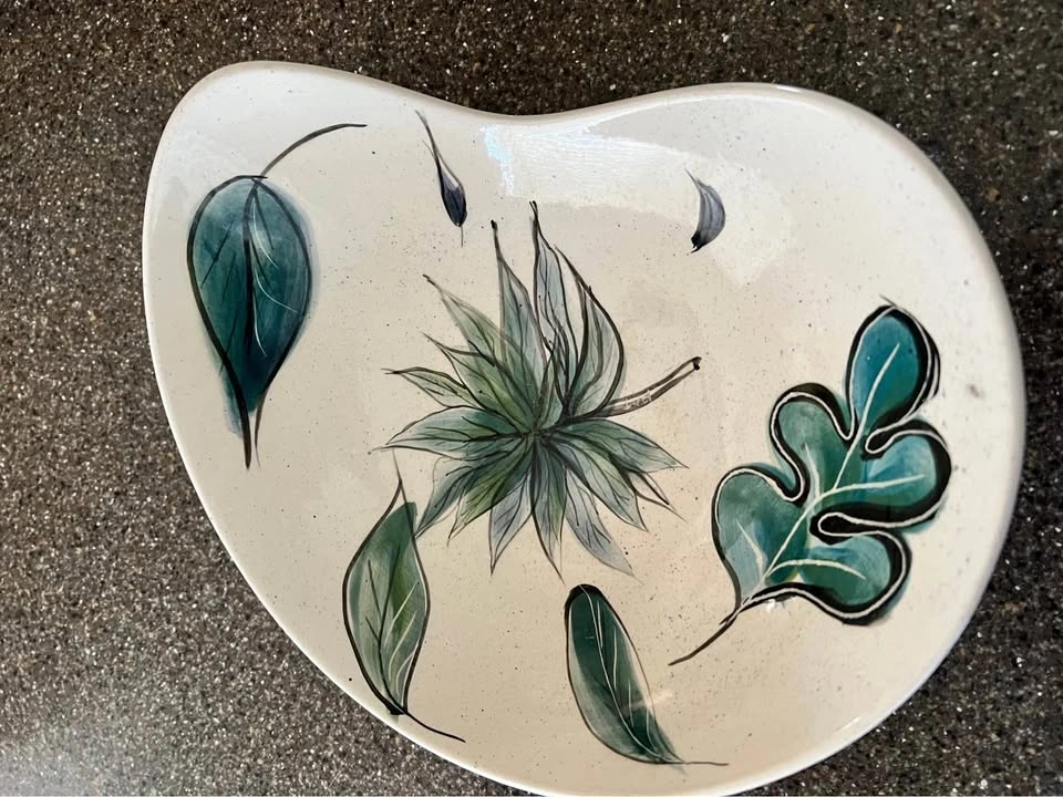 Beautiful MCM kidney shaped cream colored dish with hand painted leaves. Very good condition. Signed. Measurements: Length almost 10", Width 8". Porch pick up by 59 & Batavia Rd.