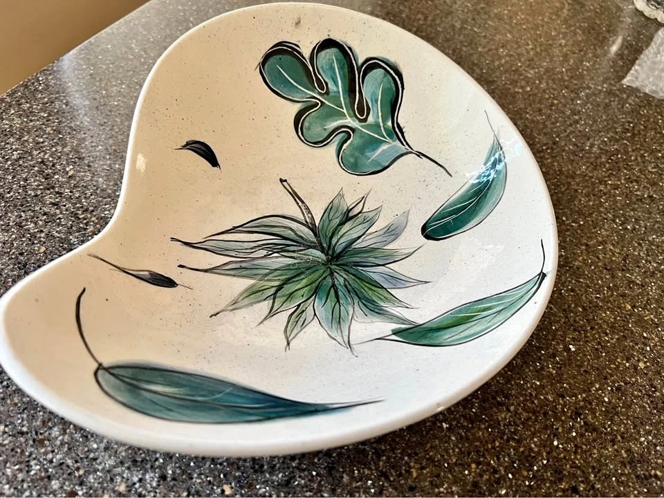 Beautiful MCM kidney shaped cream colored dish with hand painted leaves. Very good condition. Signed. Measurements: Length almost 10", Width 8". Porch pick up by 59 & Batavia Rd.