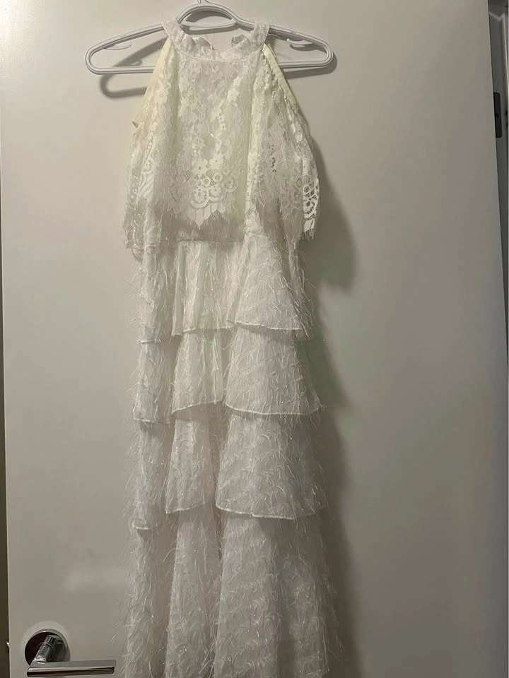 Beautiful white dress. Has a pretty lace halter top. Skirt is tiered with cool shaggy fringe detail. Super flowy. Pick up at King Edward Station.