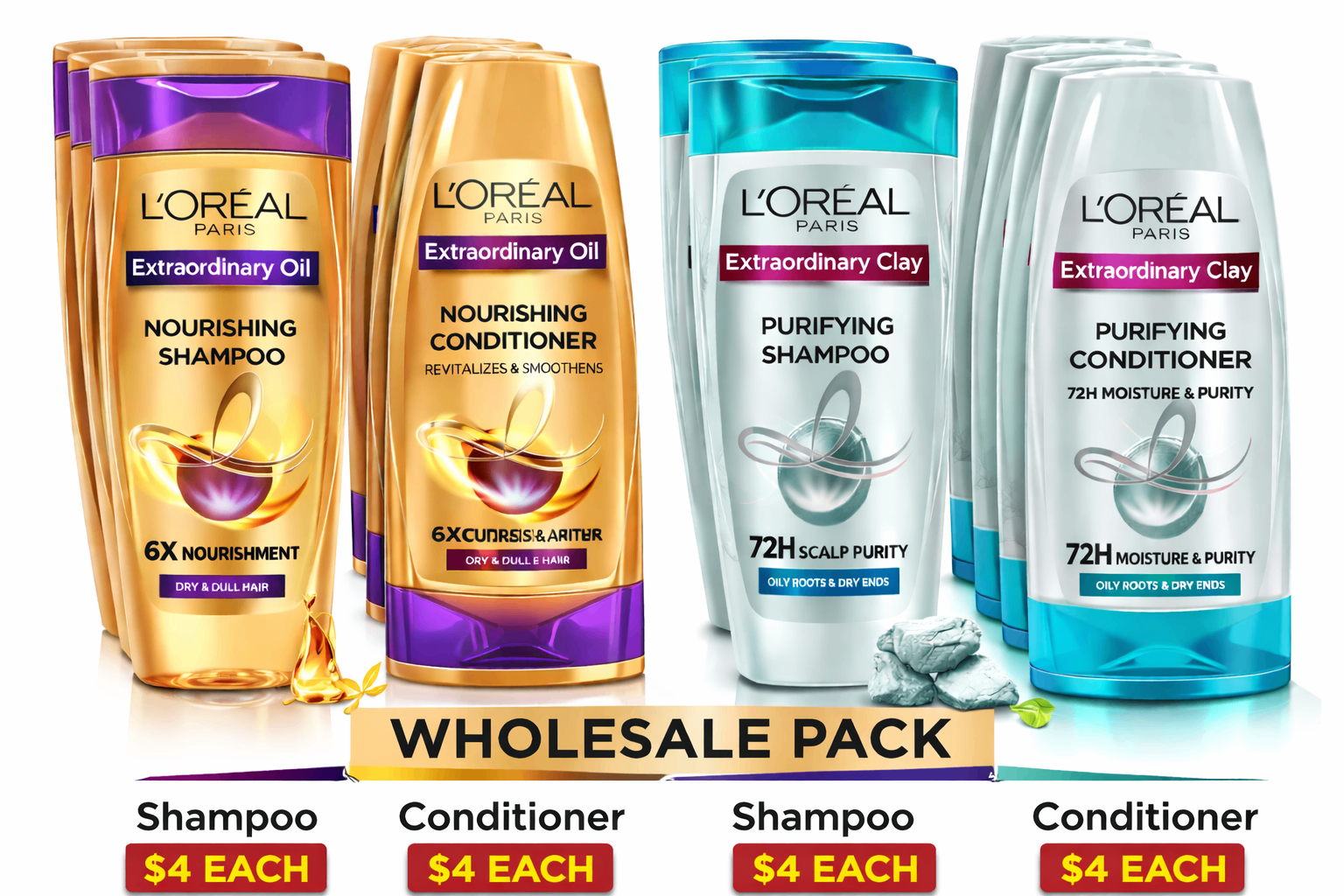 Four bottles of L'Oréal Paris hair products.
