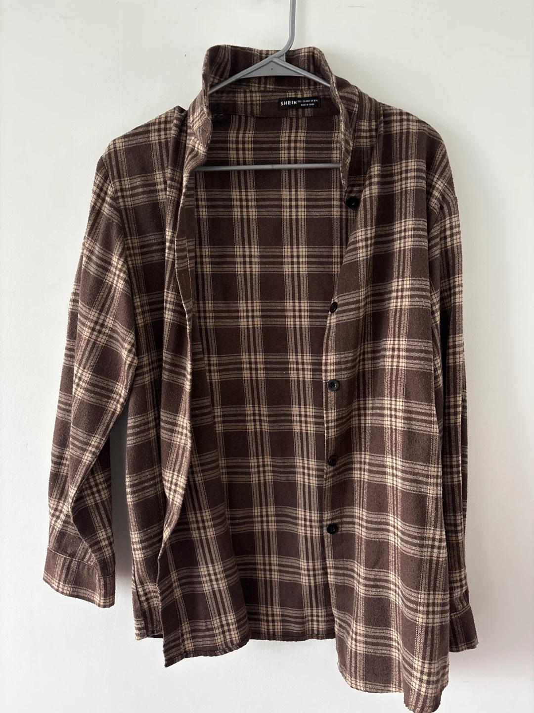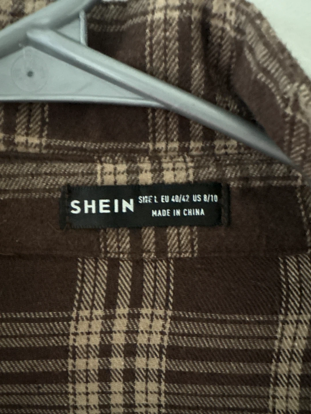 A brown and beige plaid flannel shirt from SHEIN. It's a size L, EU 40/42, and US 8/10. Made in China. This shirt's classic plaid pattern makes it a versatile piece for layering or wearing on its own.