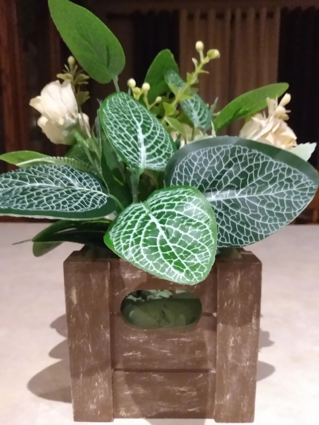 This decorative piece features artificial flowers and greenery arranged in a rustic wooden planter. It's great for adding a touch of nature to any room without the need for watering. The planter is made of wood and measures approximately 5x5 inches.