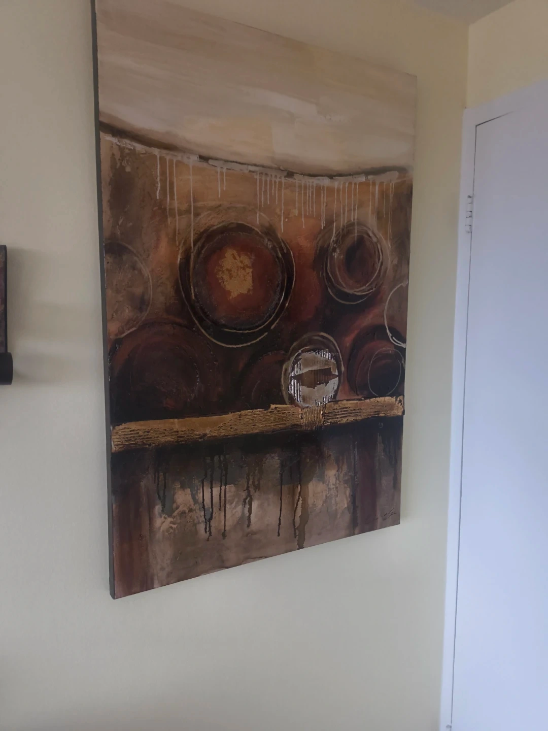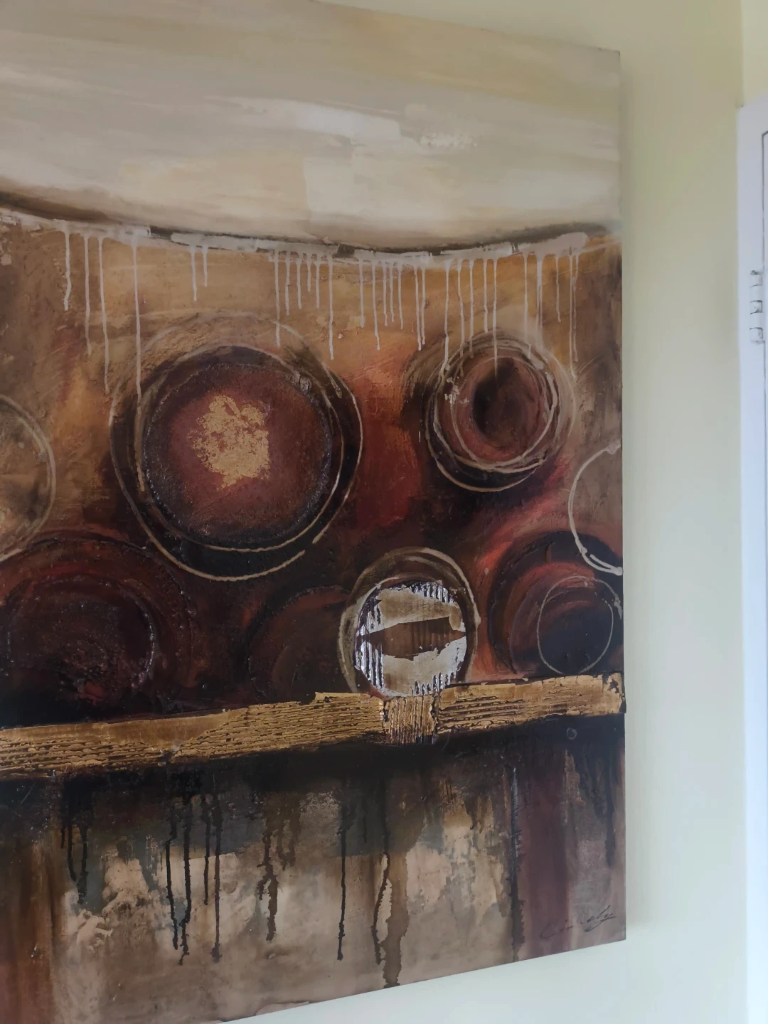 Canvas wall art with abstract circle designs. Earthy tones of brown, rust, and gold. Drip effects and textured elements add depth. Measures approximately 24"x36". Adds a unique touch to any room!