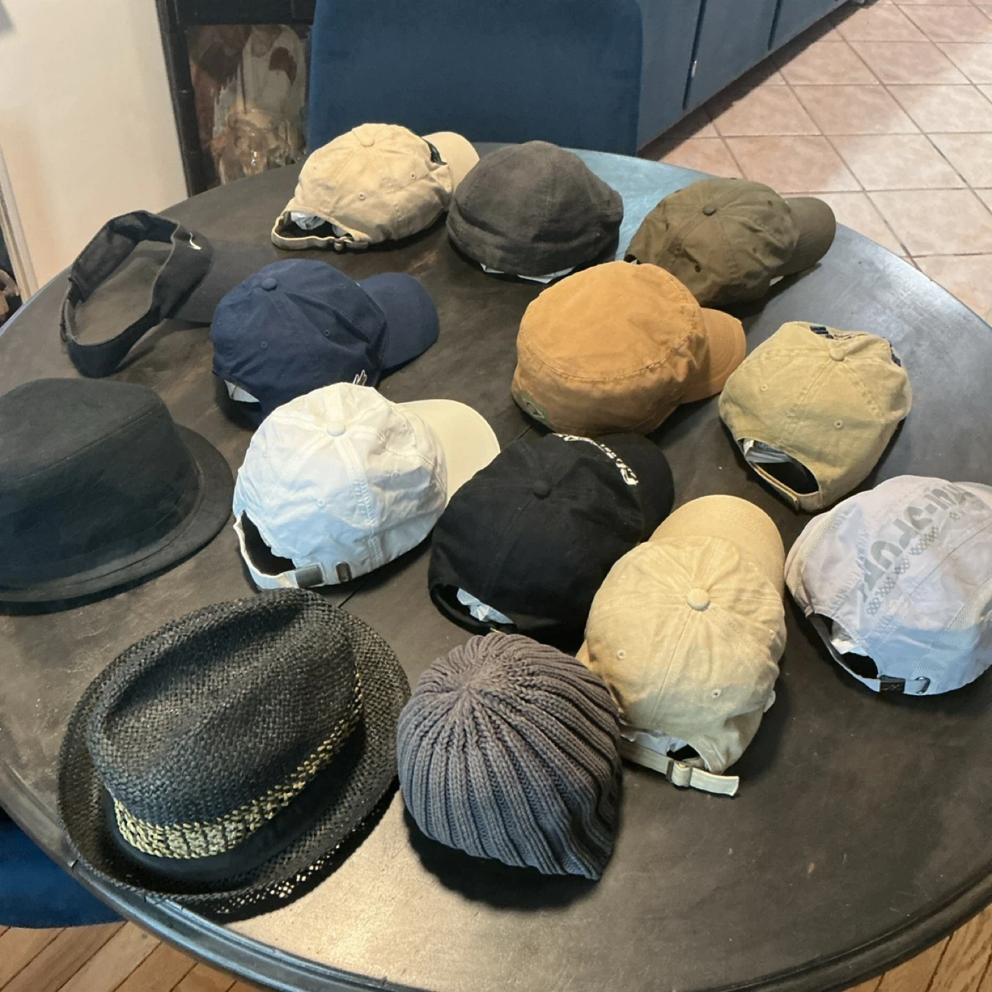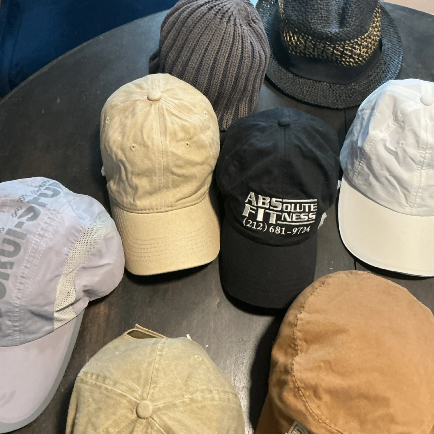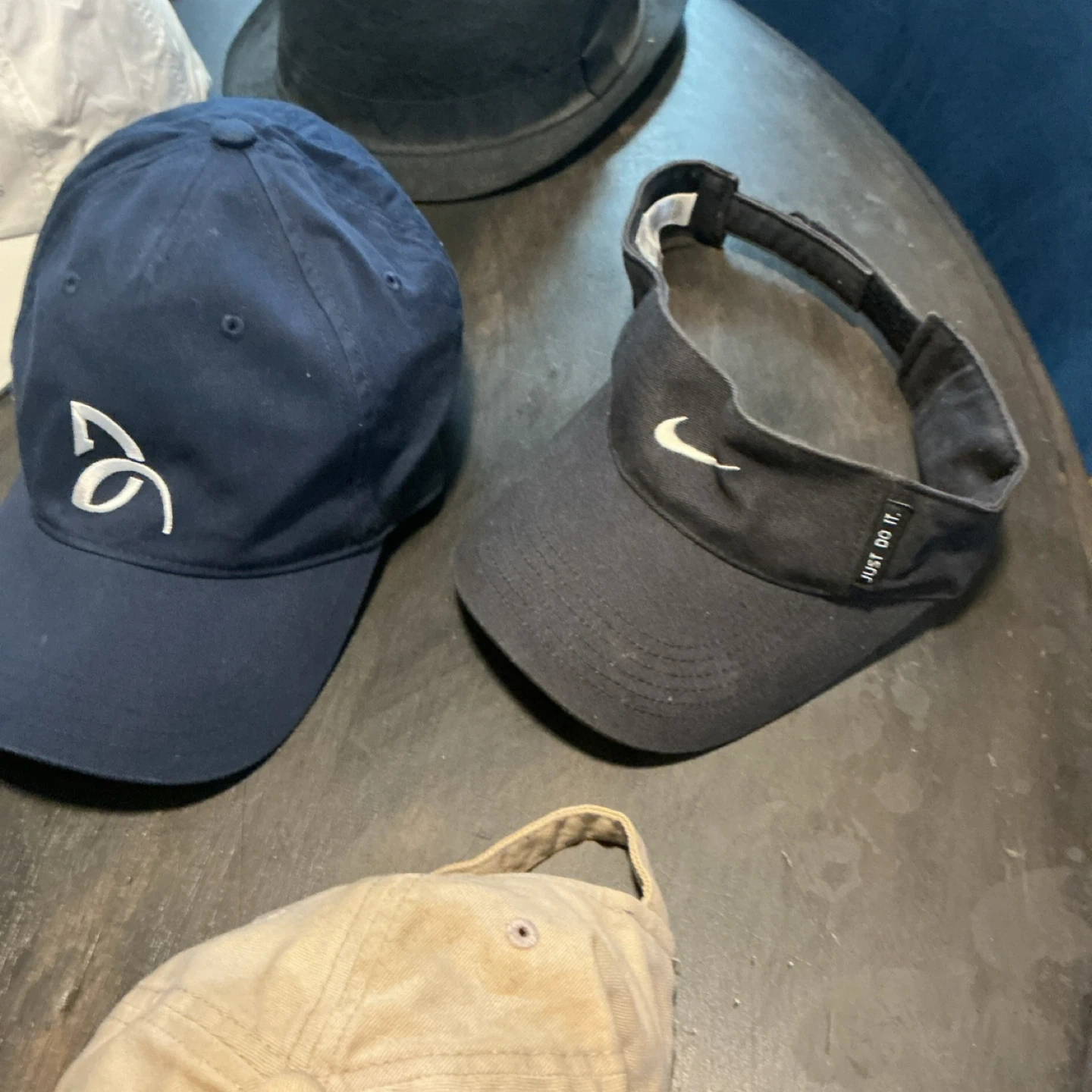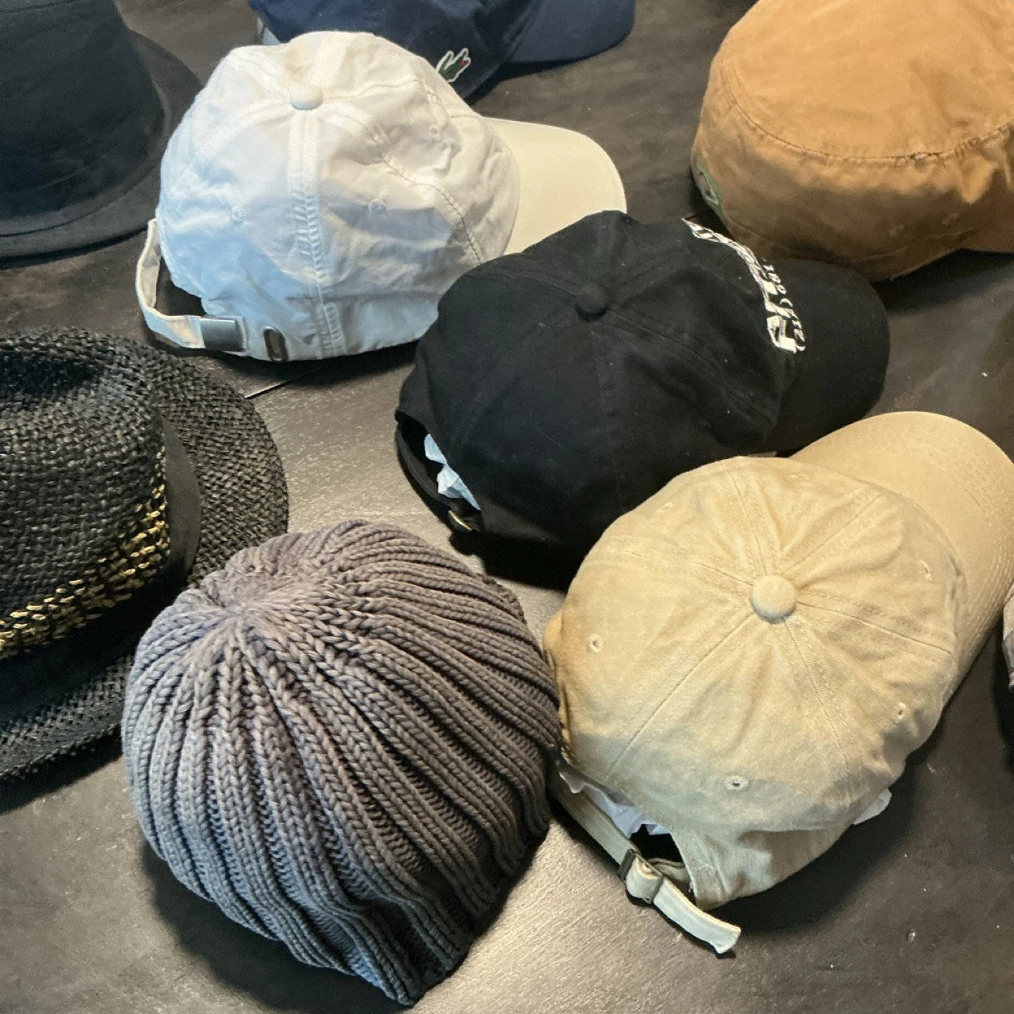 Collection of hats and caps including a black fedora, a woven straw hat with a decorative band, and various baseball caps. Brands visible include Lacoste and Nike. Materials vary from woven straw to cotton and knit.