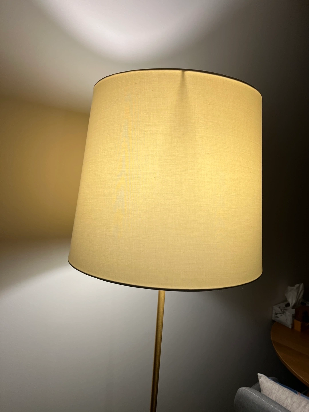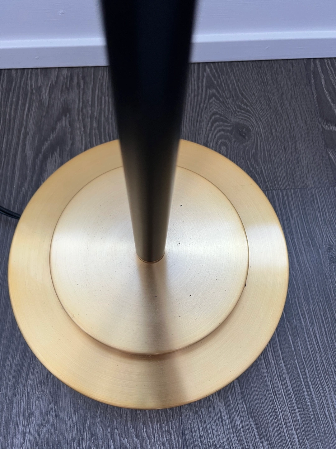 Selling a floor lamp with a gold base and black accents! It has a neutral-coloured shade and a convenient foot switch on the cord