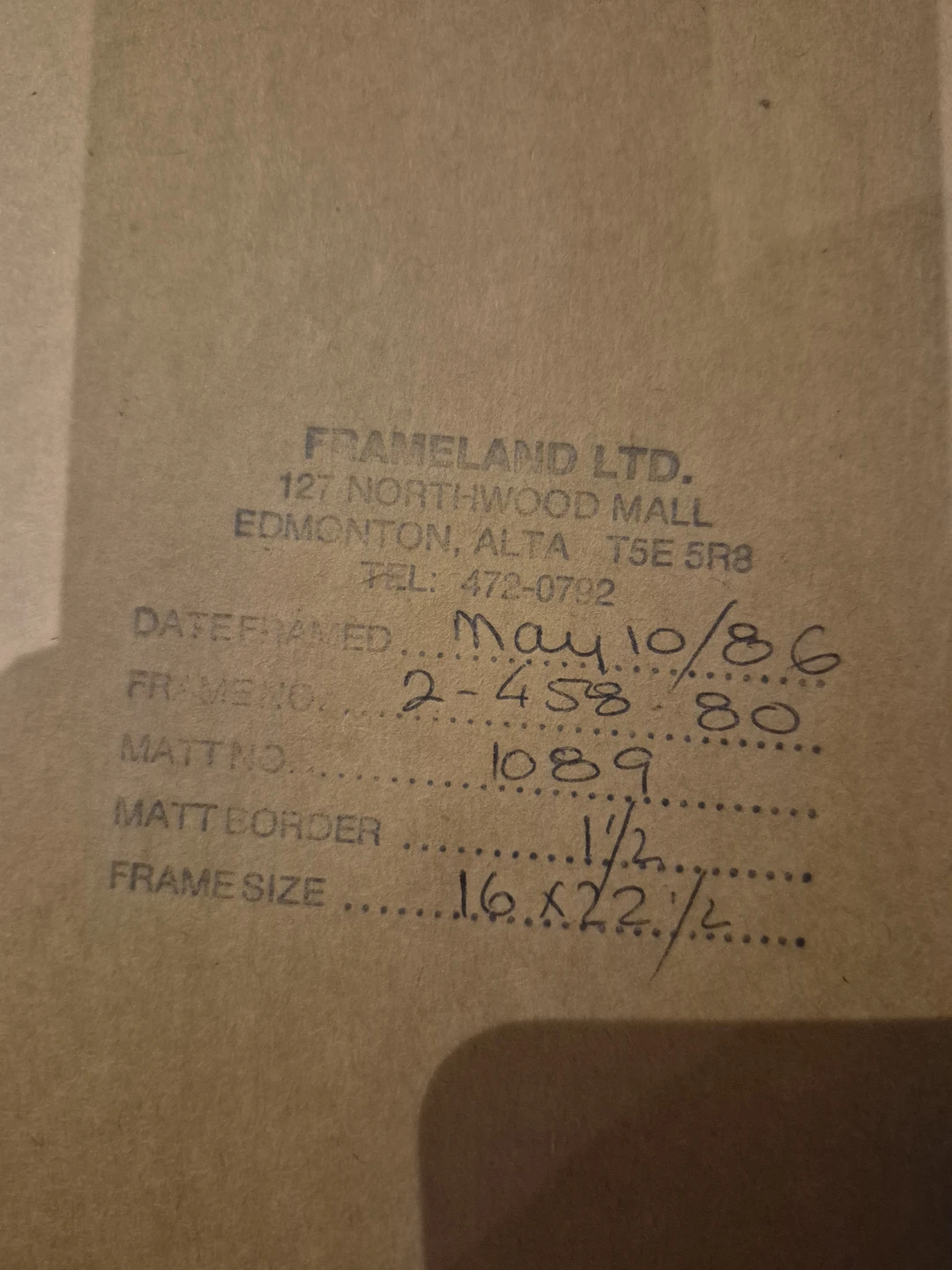 Framed needlepoint art with a wooden frame. The frame size is 16 x 22 1/2 inches. The date framed was May 10, 1986.