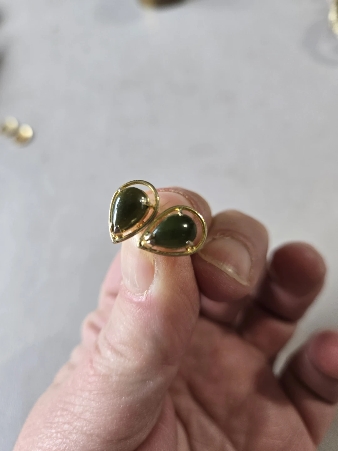 Selling a pair of green stone earrings. They feature a teardrop-shaped green stone set in a gold-tone metal. Perfect for adding a touch of elegance to any outfit!