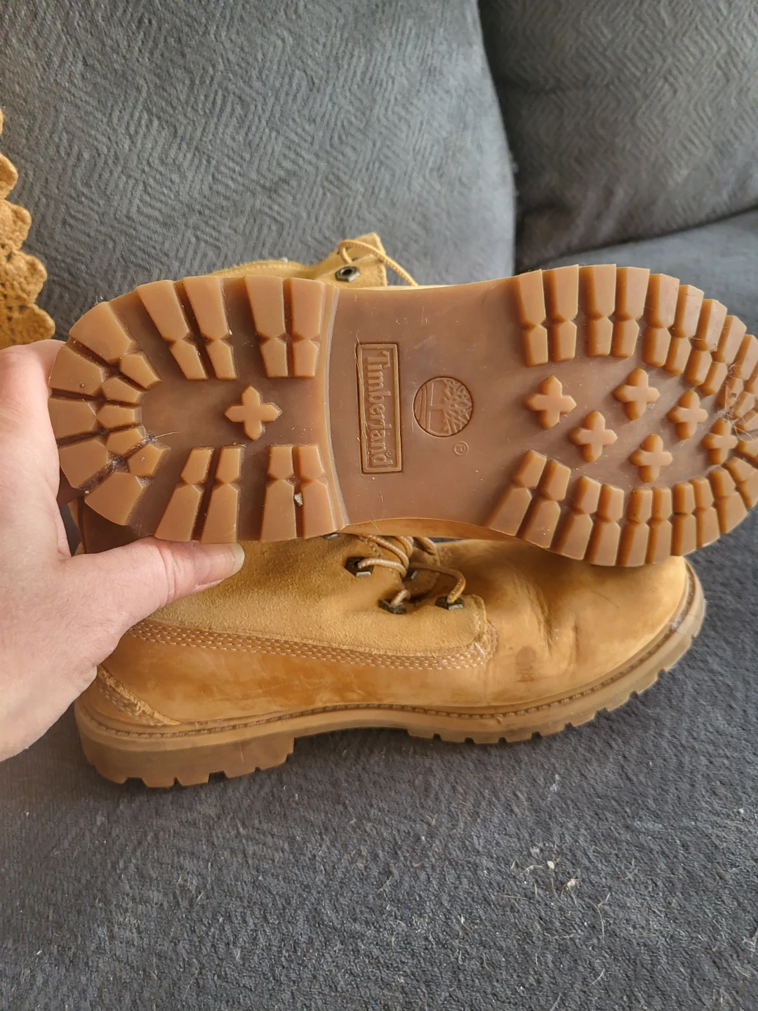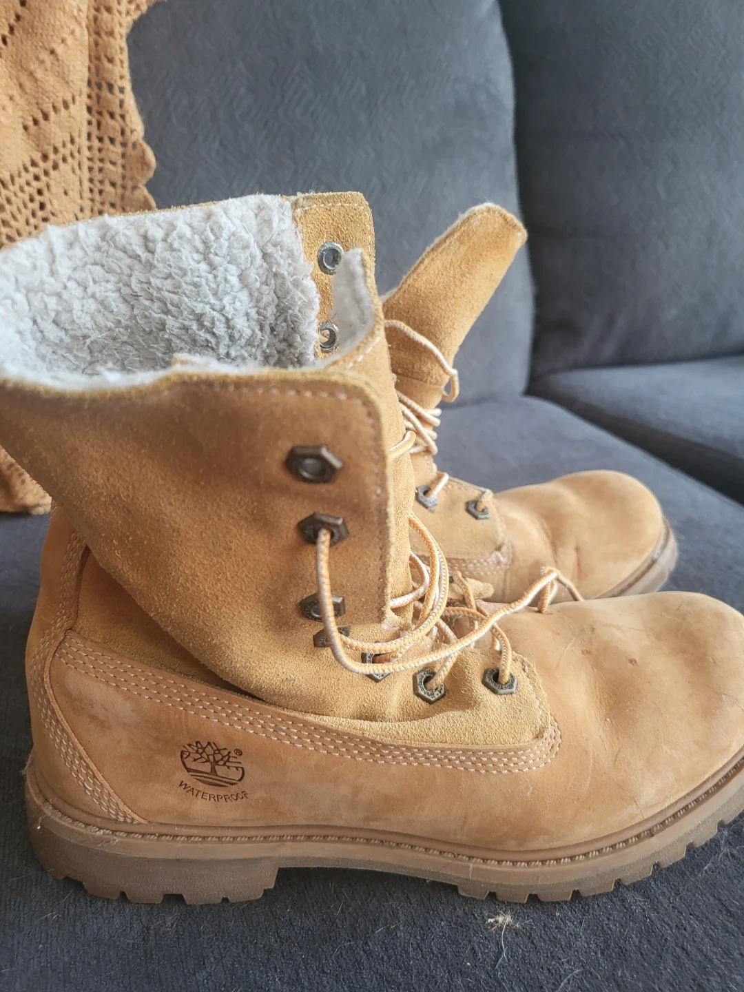 Timberland waterproof boots in a tan suede. They feature a cozy sherpa lining for extra warmth. Durable rubber lug sole for great traction.needs cleaning