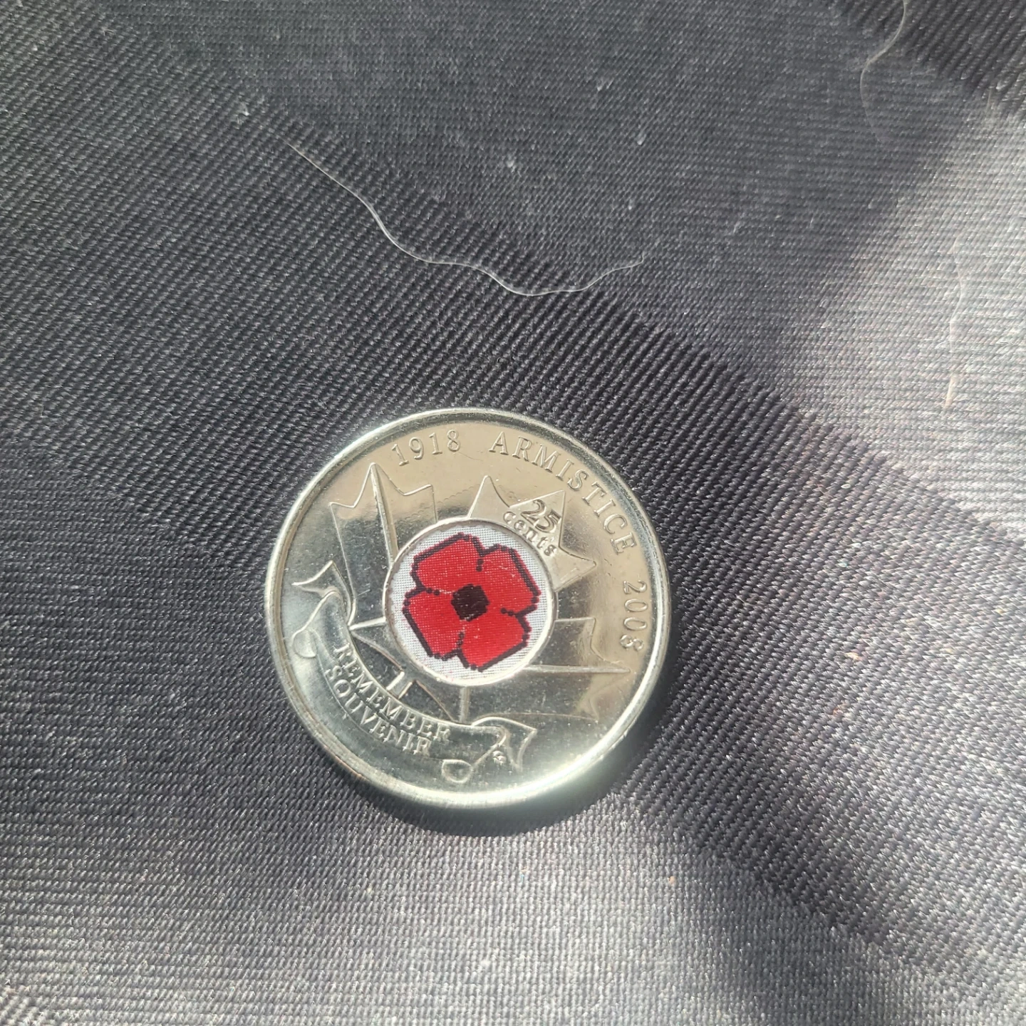 This is a 2008 25 cent coin commemorating Armistice. It features a poppy and says 'Remember Souvenir'. It's a special commemorative coin.