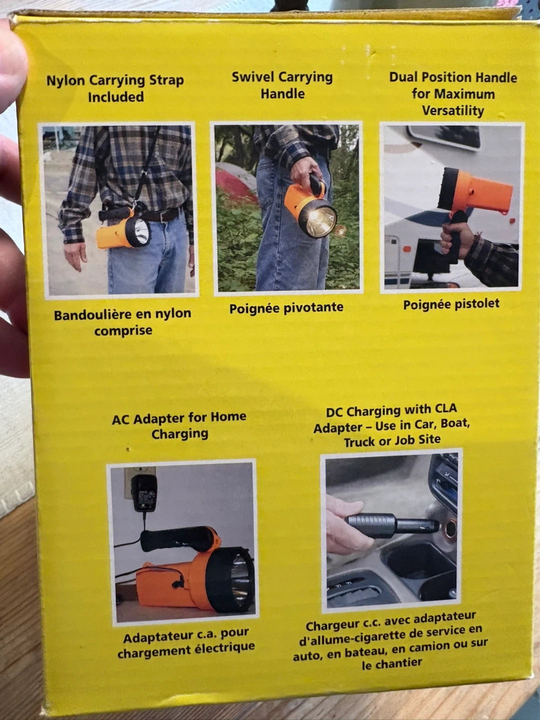 This Sunforce spotlight offers 1 million candle power and is AC/DC rechargeable. It's excellent for car, boat, workshop, camping, fishing, and outdoor use. Includes a rechargeable long-life battery and AC charger.