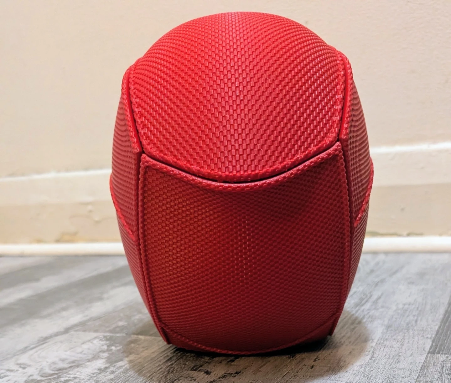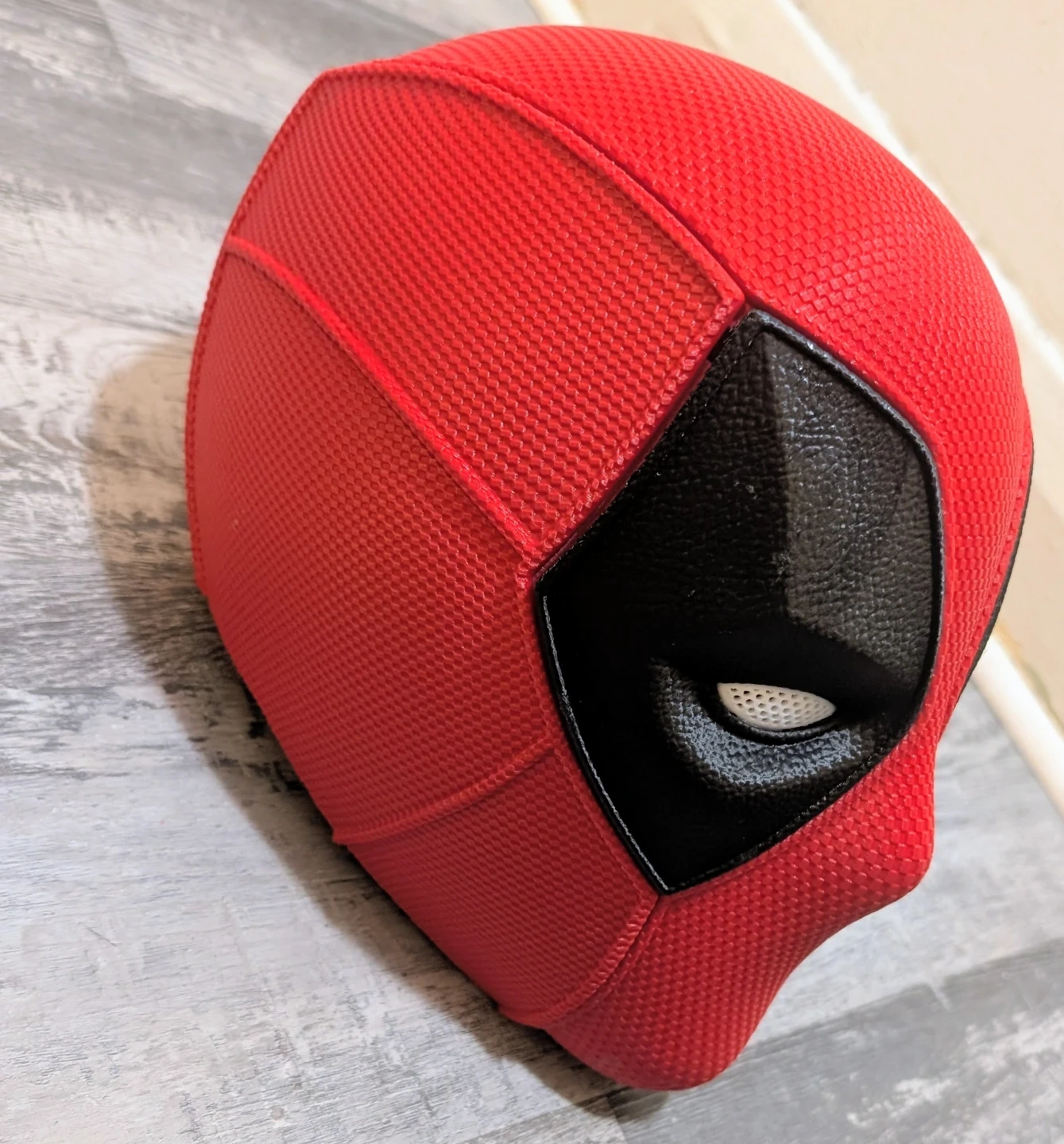 This is a 3D printed helmet of a Marvel antihero Deadpool. It's made of a textured red material with black accents for the eyes. It's magnetic.