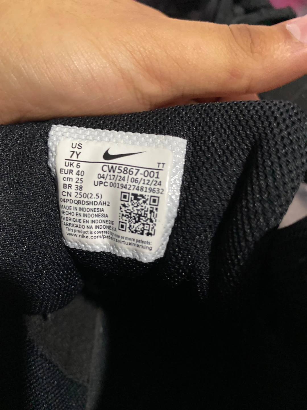 Black Nike Air Force 1 high top sneakers for youth. Size 7Y. These shoes are black with a lace-up closure and a velcro strap at the top. Made in Indonesia.