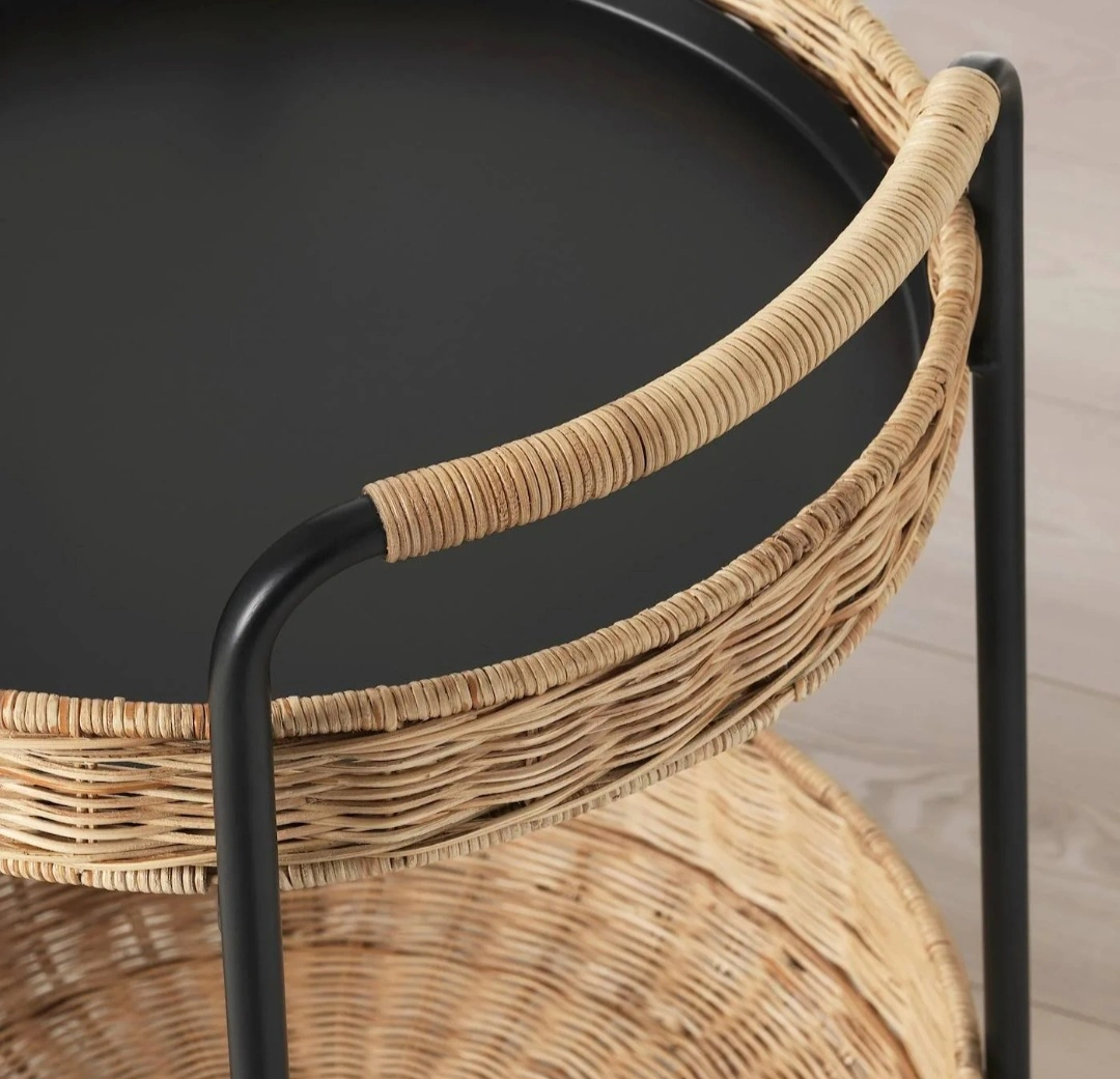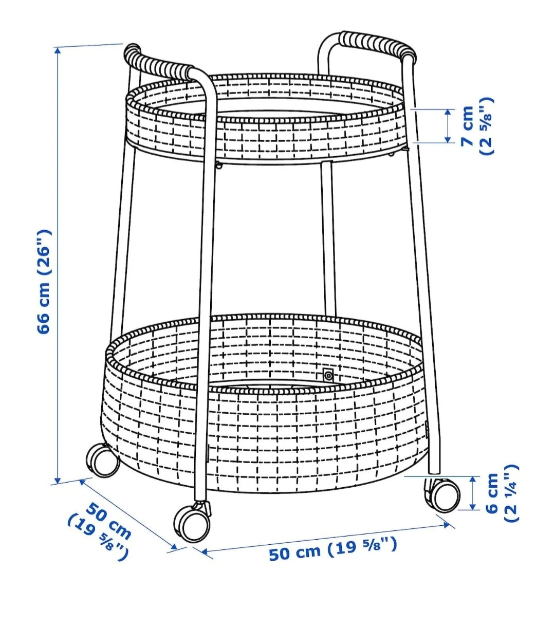 This cart features a black metal frame and two wicker baskets. It has wheels for easy mobility and a top tray that is great for serving or displaying items.