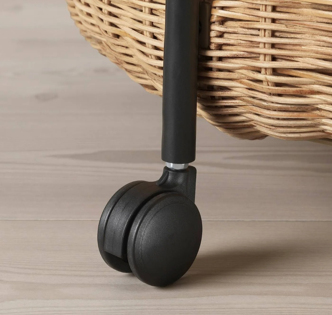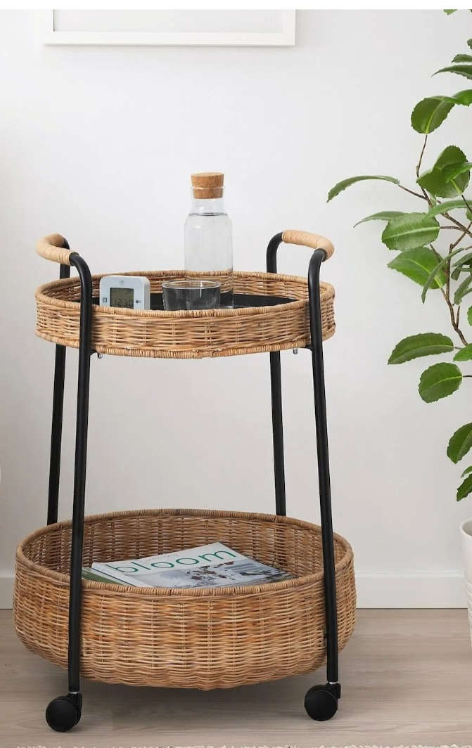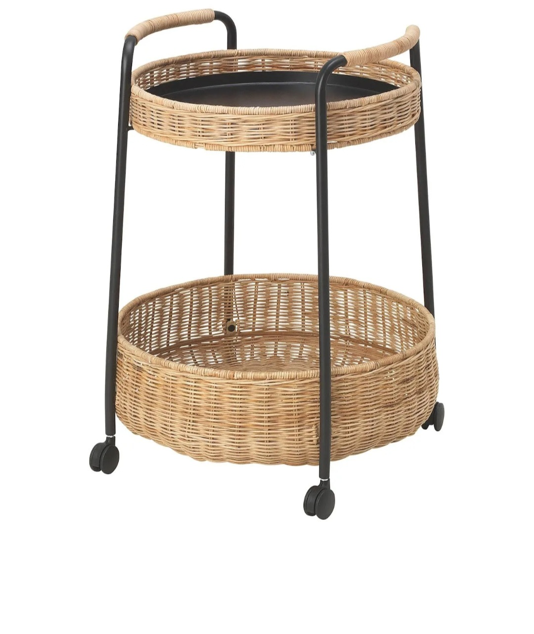 This cart features a black metal frame and two wicker baskets. It has wheels for easy mobility and a top tray that is great for serving or displaying items.