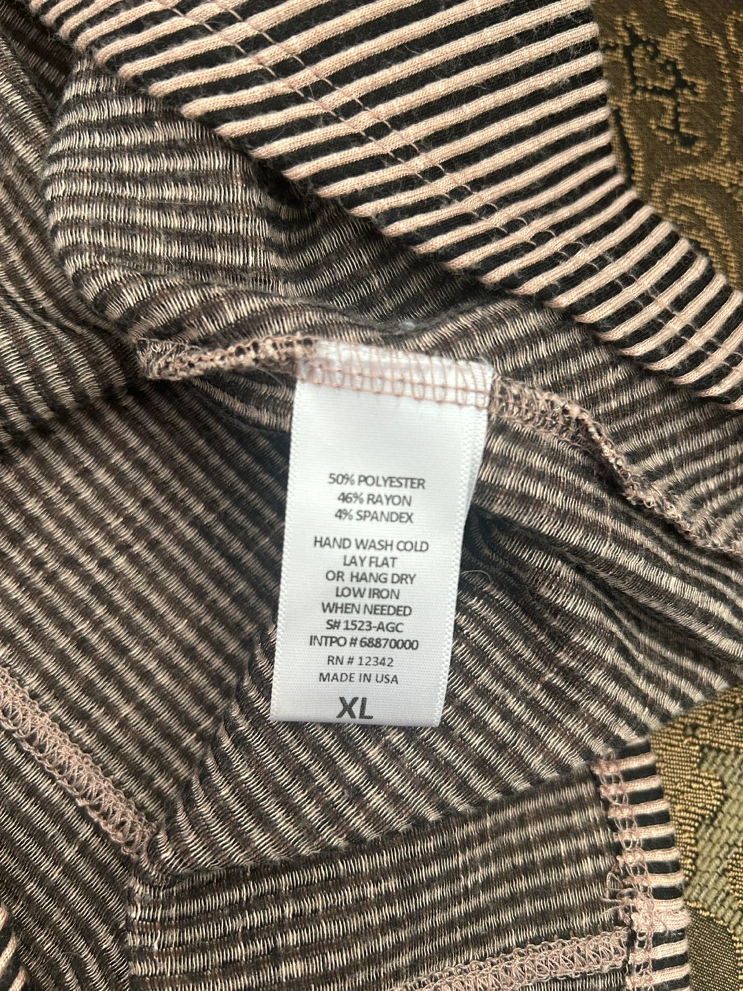 This COIN 1804 sleeveless top features a vertical stripe pattern and a twist front detail. It's made of 50% polyester, 46% rayon, and 4% spandex. Tag indicates size XL. Hand wash cold, lay flat or hang dry, and low iron if needed.
