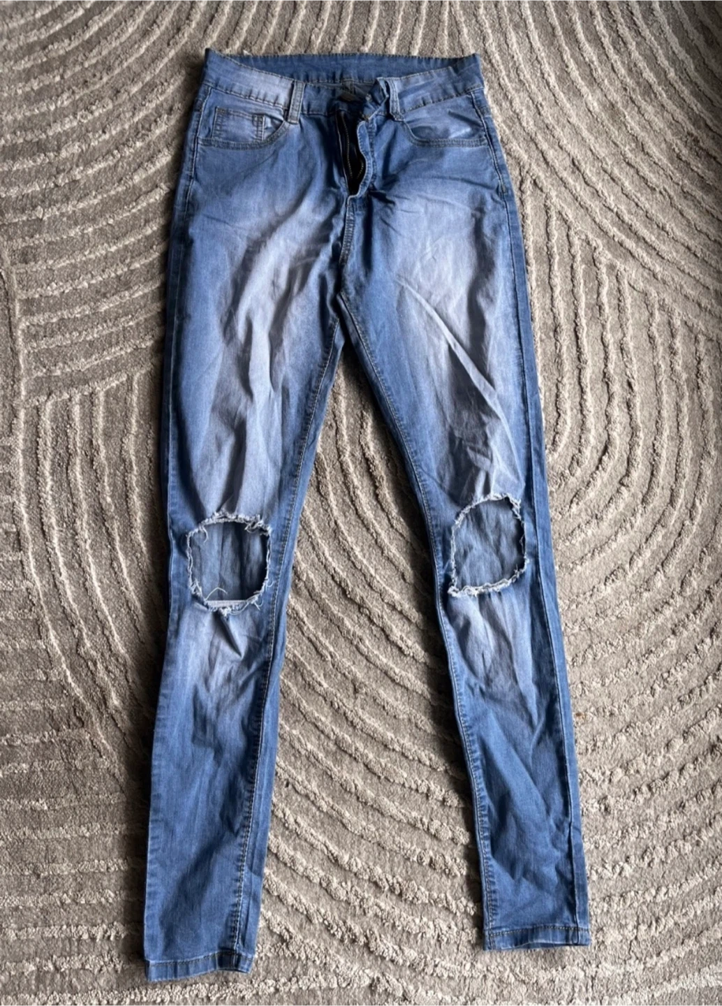 These are light wash skinny jeans with rips at the knees. They're made of denim. Great for a casual look!