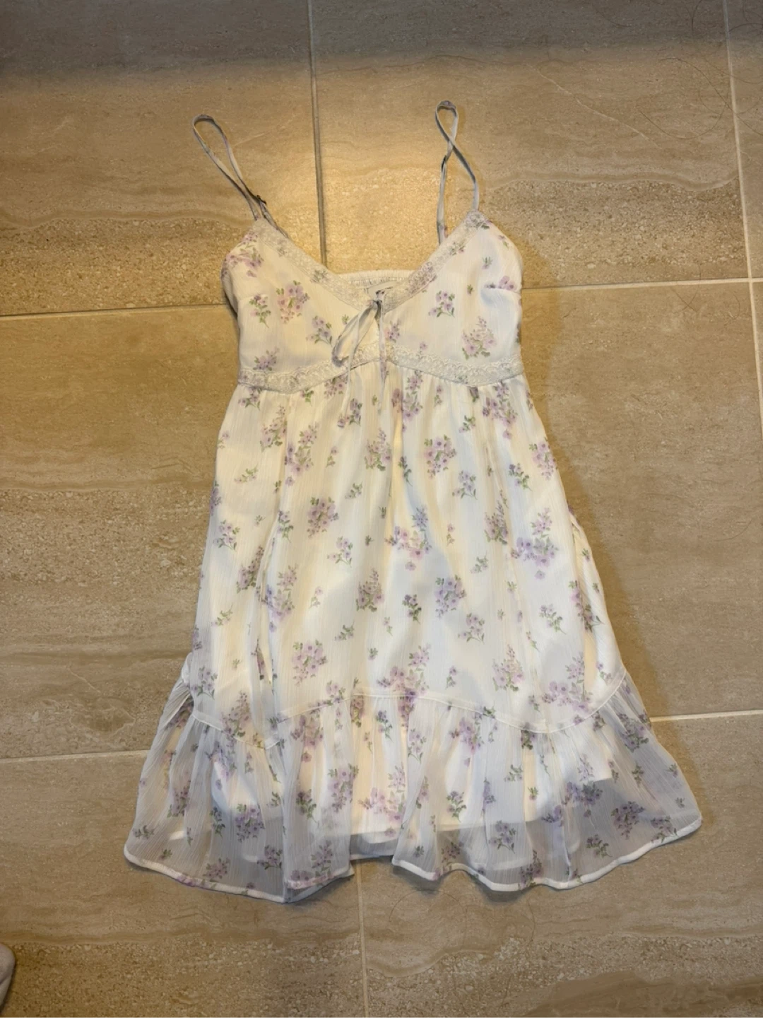 White floral babydoll dress with purple accents. Lace trim detail. Size XS. Perfect for summer outings! WORN ONCE FOR PHOTOS