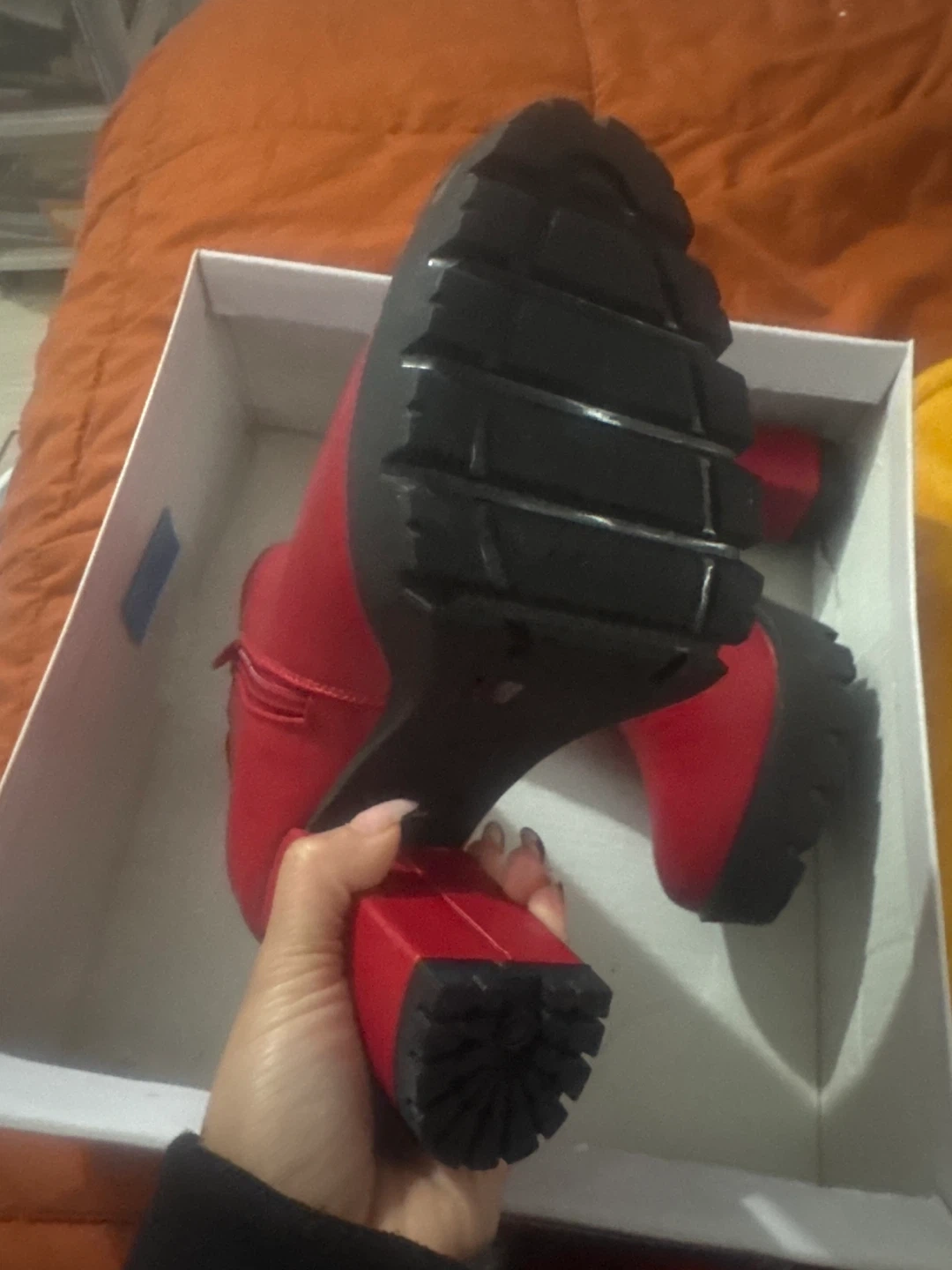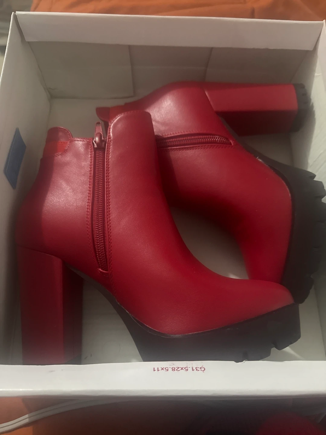 These True Craft ankle boots are red with a chunky heel and platform sole. They're made of PU material and feature a side zipper closure. Includes original box. Brand new never been worn. Wrong size I’m a 6 and they’re a 7.