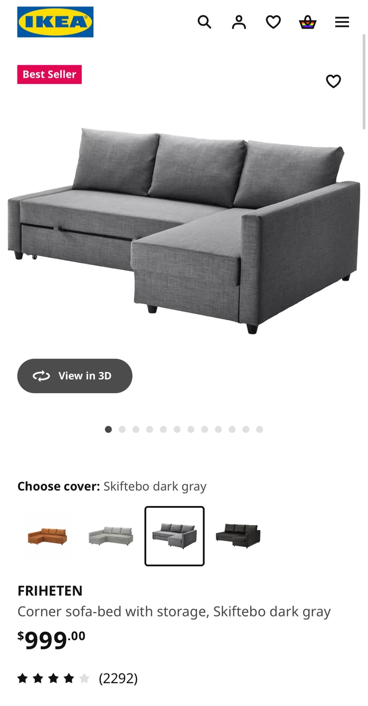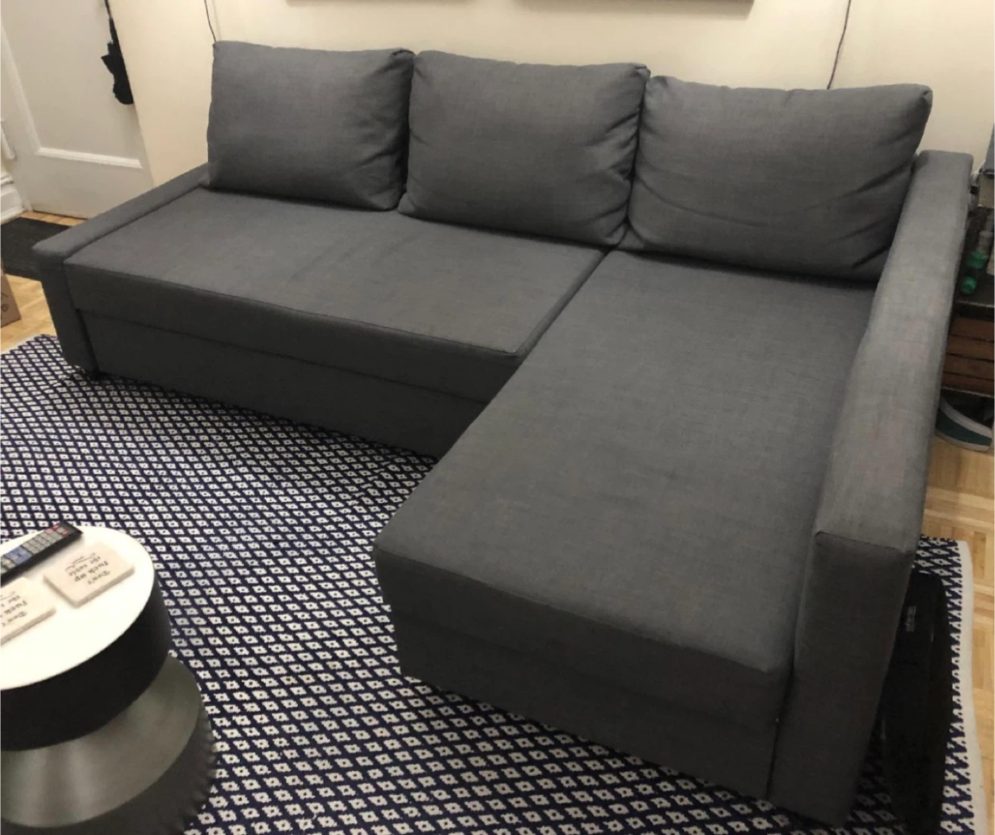 This is an IKEA FRIHETEN corner sofa-bed with storage. Clean and pet free. The chaise can go to either side and theres storage.