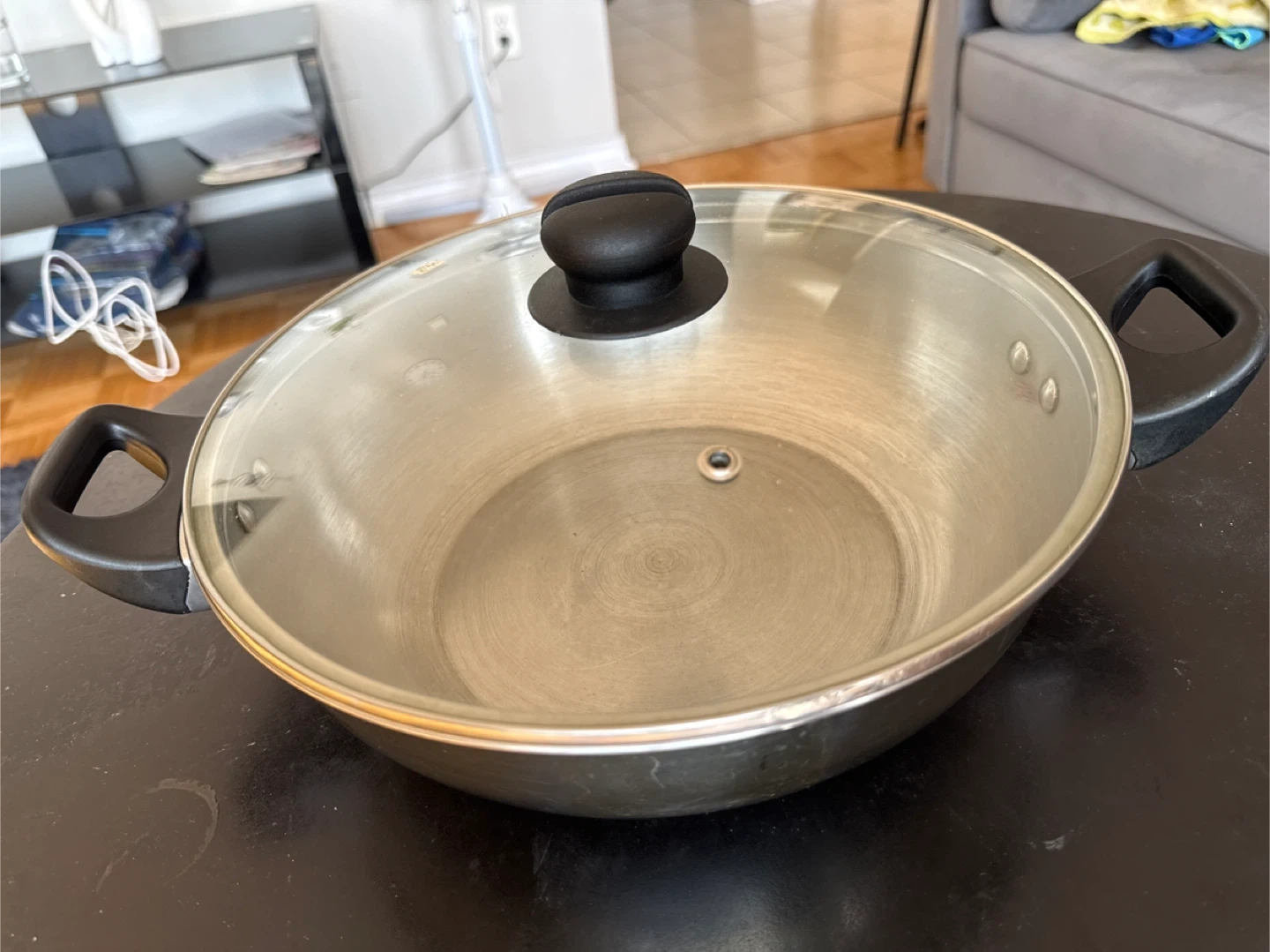 This is a stainless steel pot with a clear glass lid. It features two black handles for easy gripping. Its sturdy construction makes it suitable for various cooking tasks.