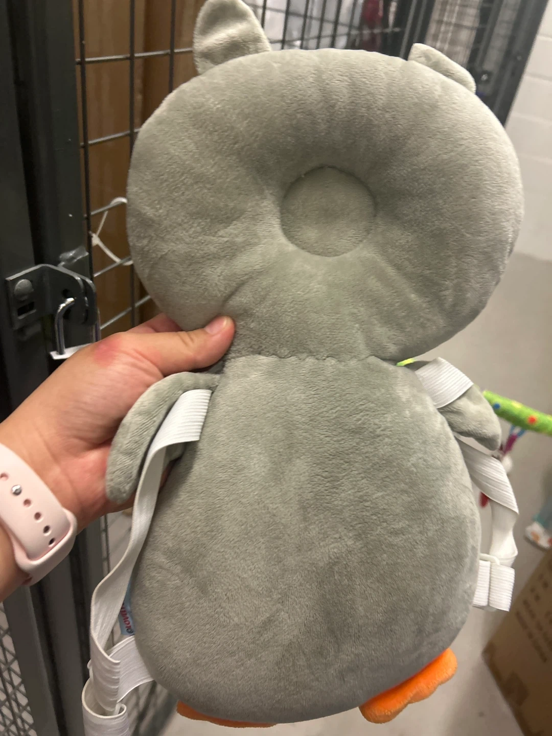 This soft, plush owl backpack is designed to protect a child's head. It features adjustable straps for a comfortable fit. It's great for babies and toddlers learning to walk!