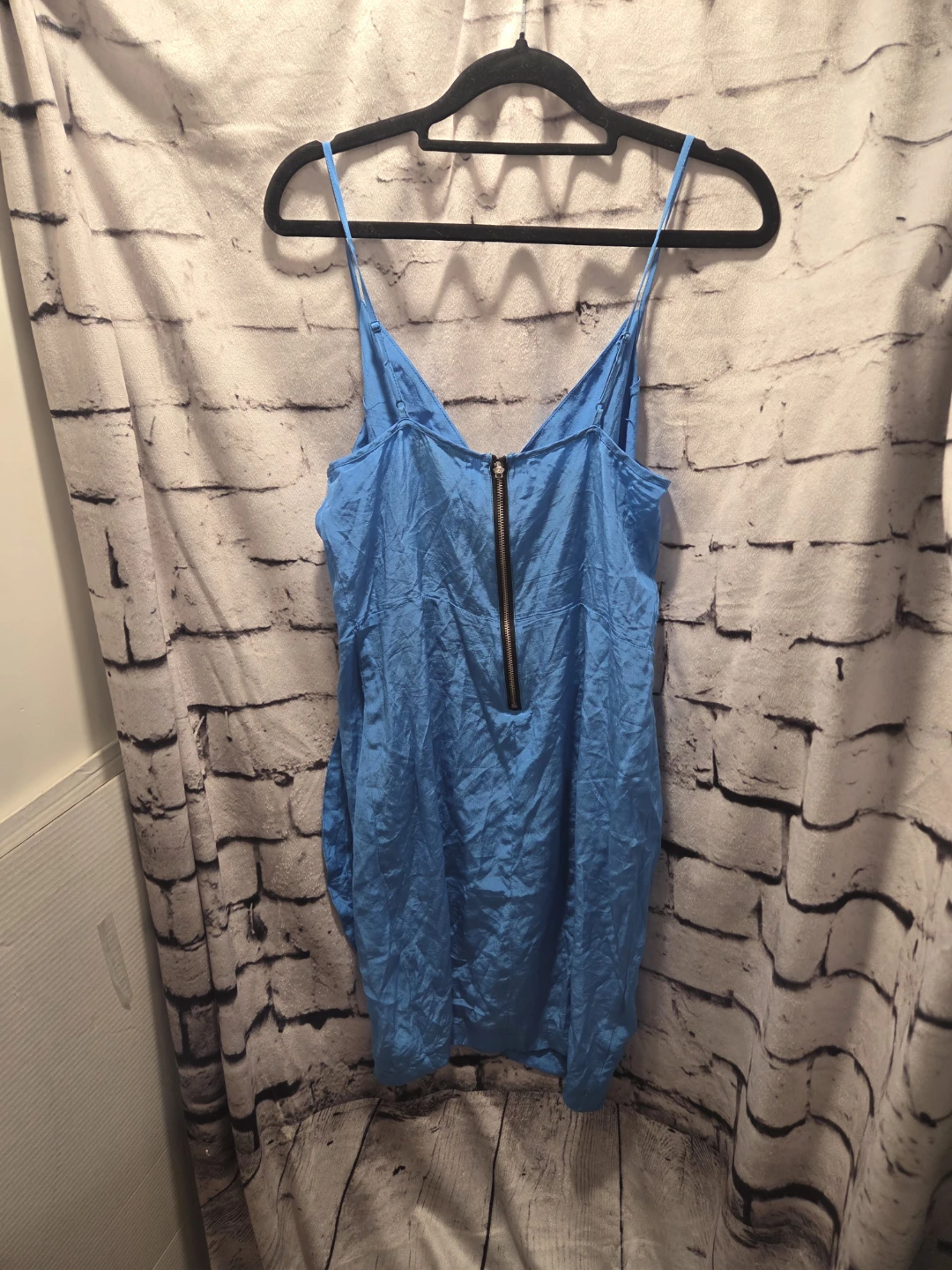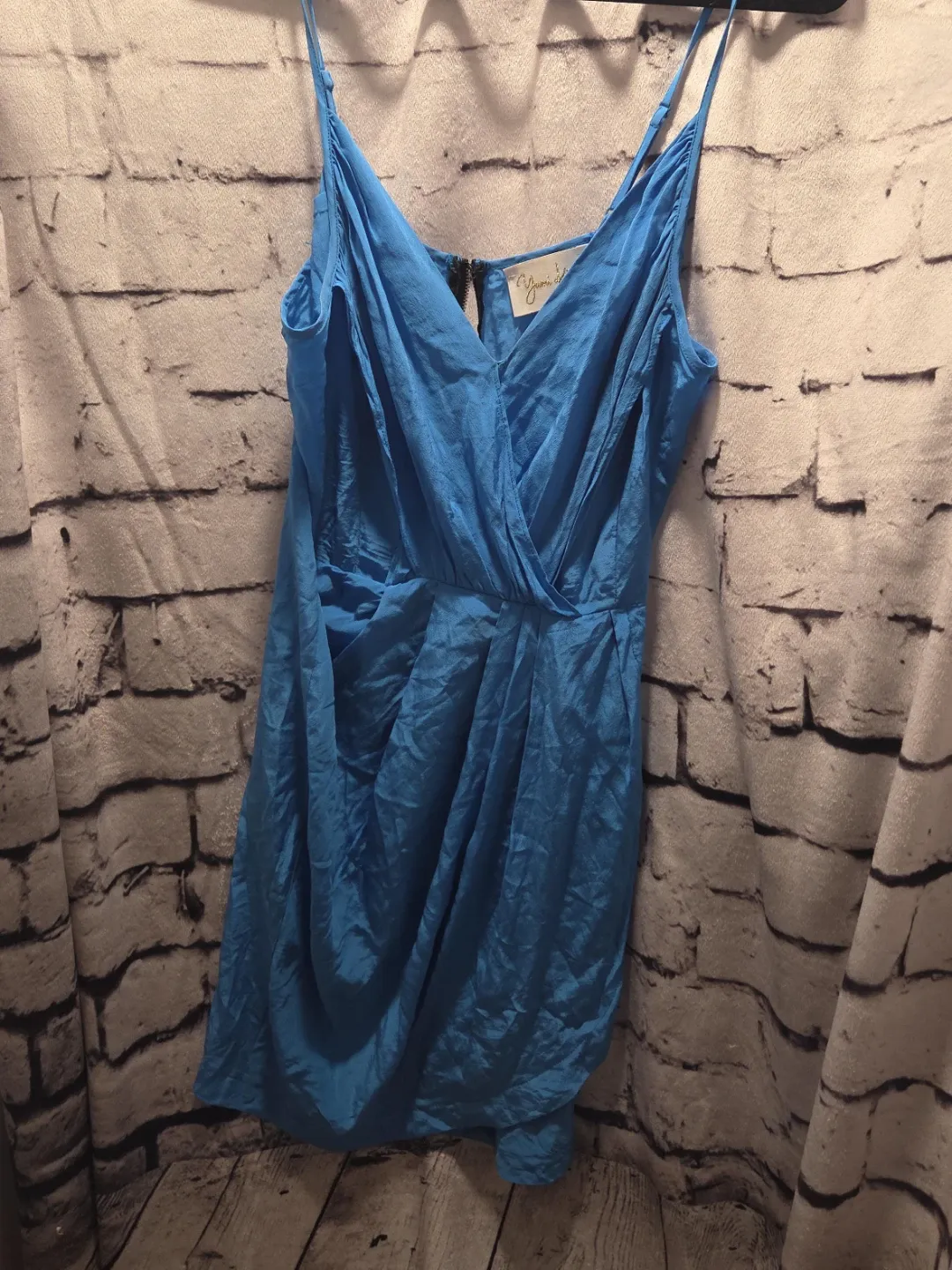 This is a Yumi Kim blue spaghetti strap wrap dress. It features a V-neckline with a faux wrap detail and ruched fabric. A back zipper closure is present. It's a stylish dress for many occasions!