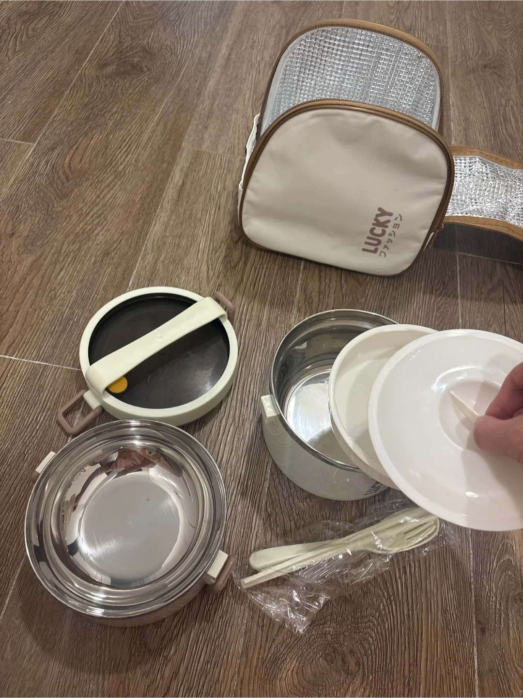 This is a Lucky Fashion insulated lunch box with two tiers. It includes a set of cutlery. The interior is insulated for keeping food warm or cold. It's perfect for carrying meals to work or school. Never used