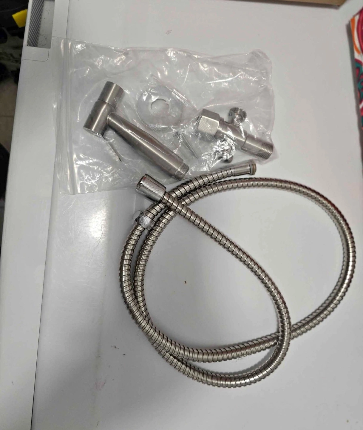 Brand new in package. Includes sprayer, hose, valve, and mounting hardware. Stainless steel finish. Easy installation.