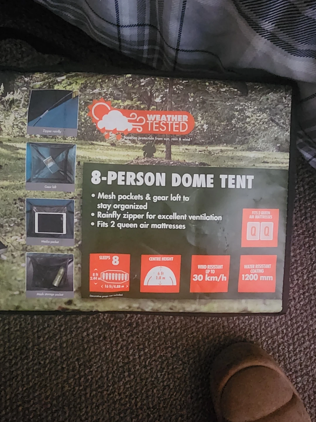 This Ozark Trail dome tent sleeps 8 people. It's weather-tested for protection from sun, rain, and wind. Features include mesh pockets and gear loft for organized storage. It also boasts a rainfly zipper for excellent ventilation. Fits 2 queen air mattresses and has a centre height of 1.8m.