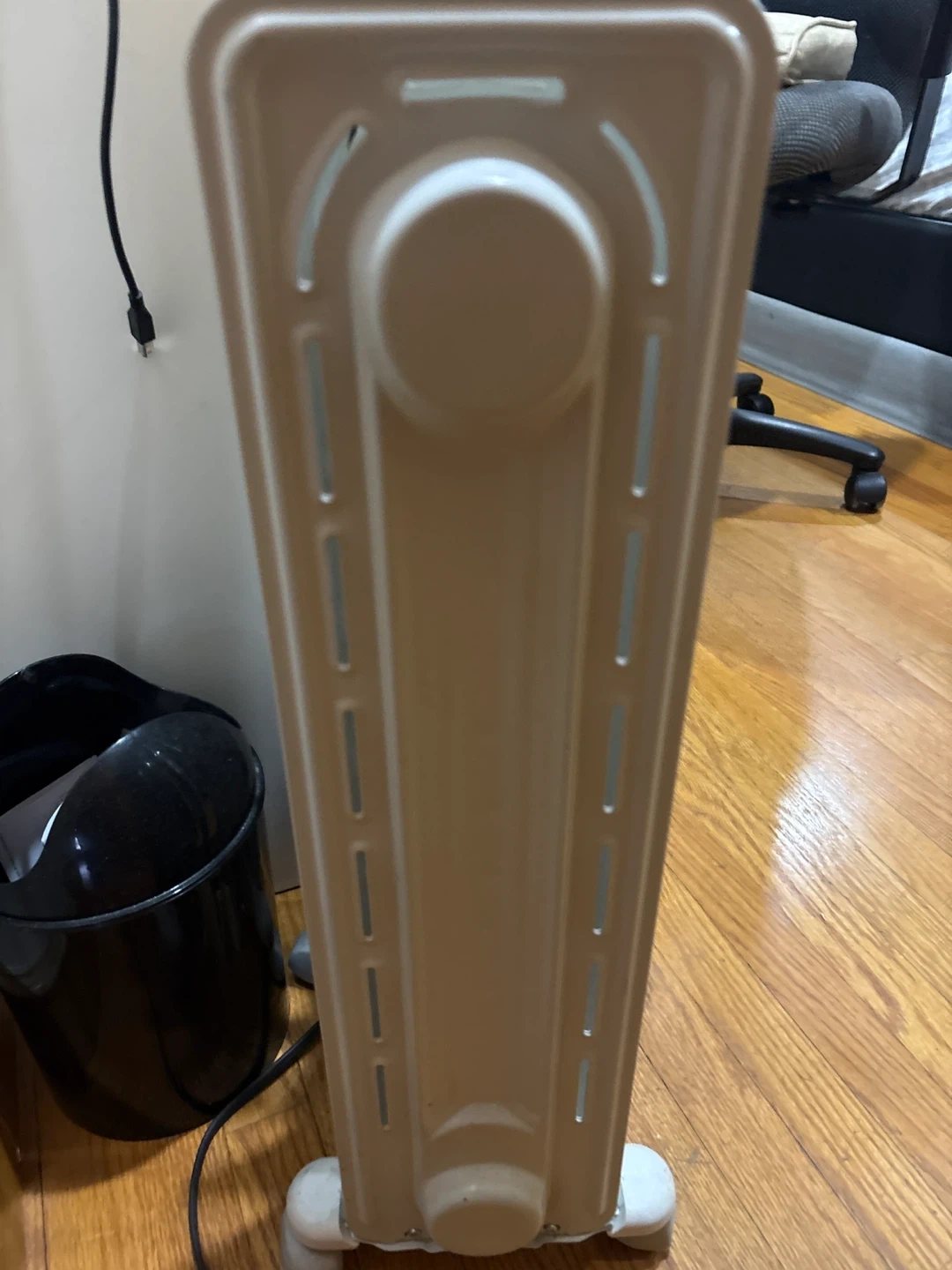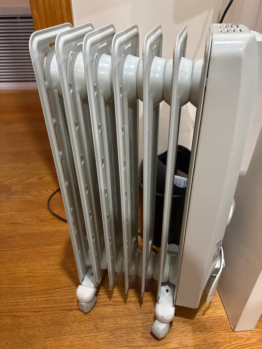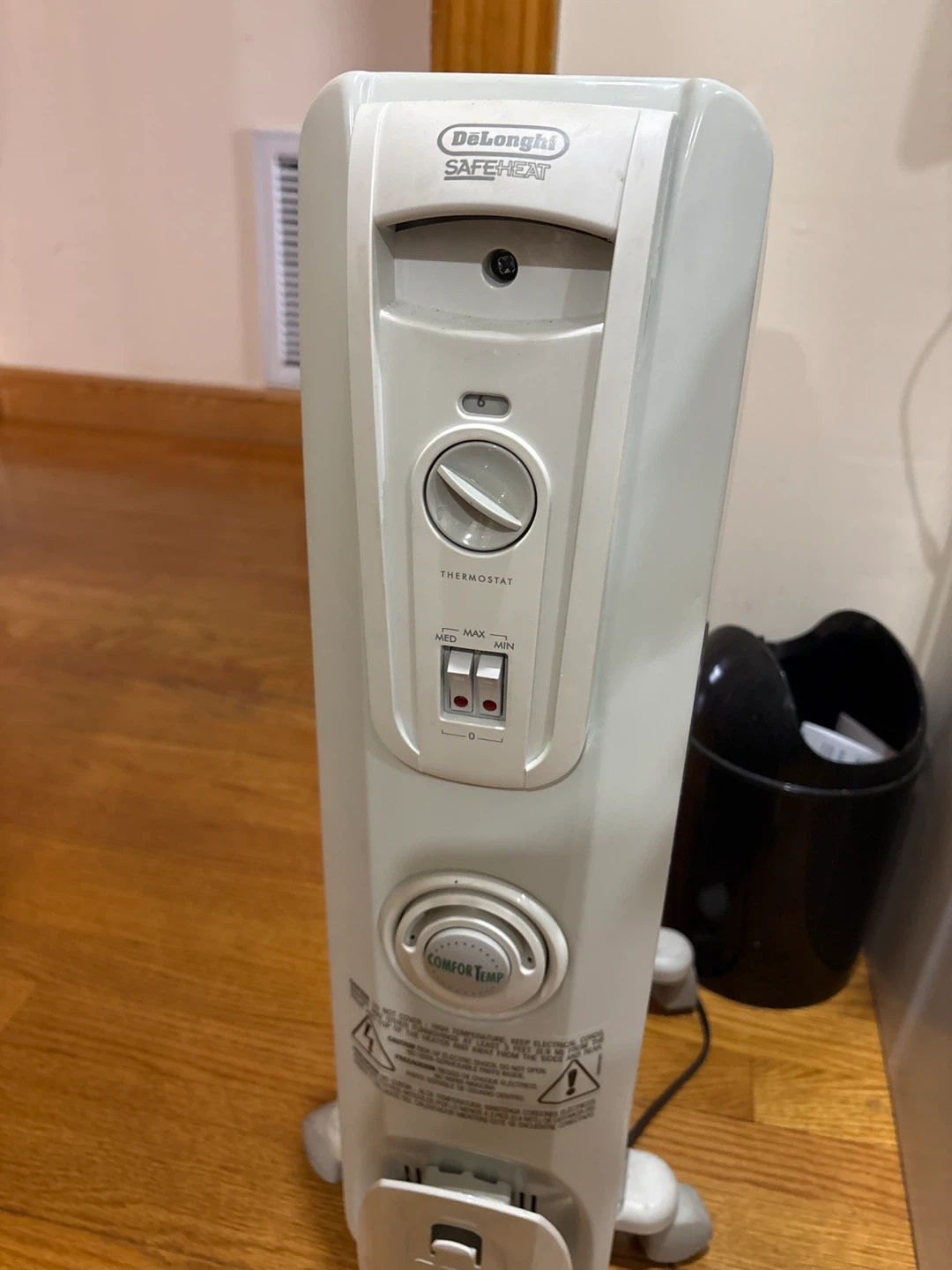 DeLonghi oil-filled radiator heater. Features adjustable thermostat and comfort temp settings. This heater's design provides quiet, even heating for rooms.