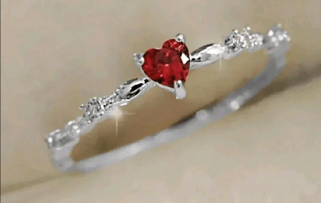 This ring features a vibrant heart-shaped red gem. It's accented with small, sparkling stones along the band. Silver-toned metal.