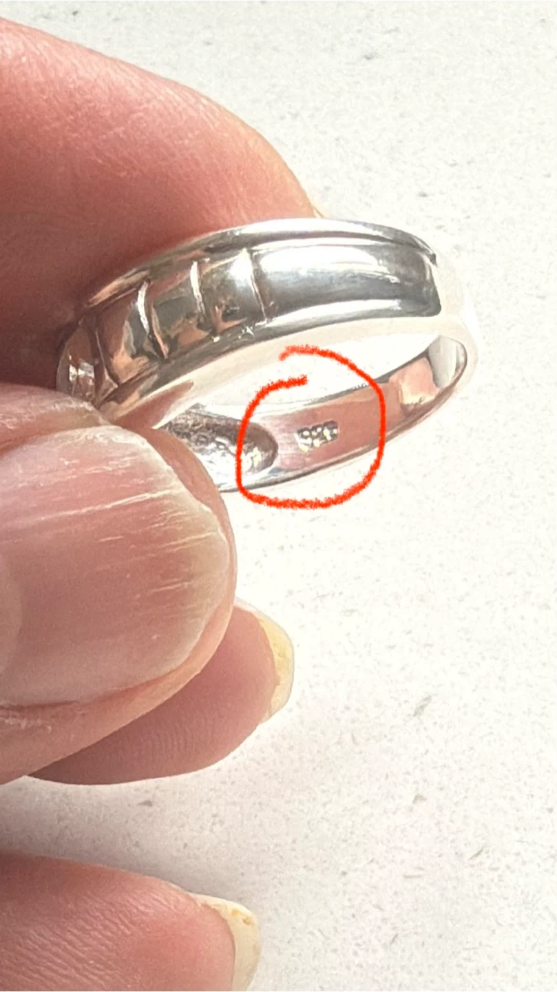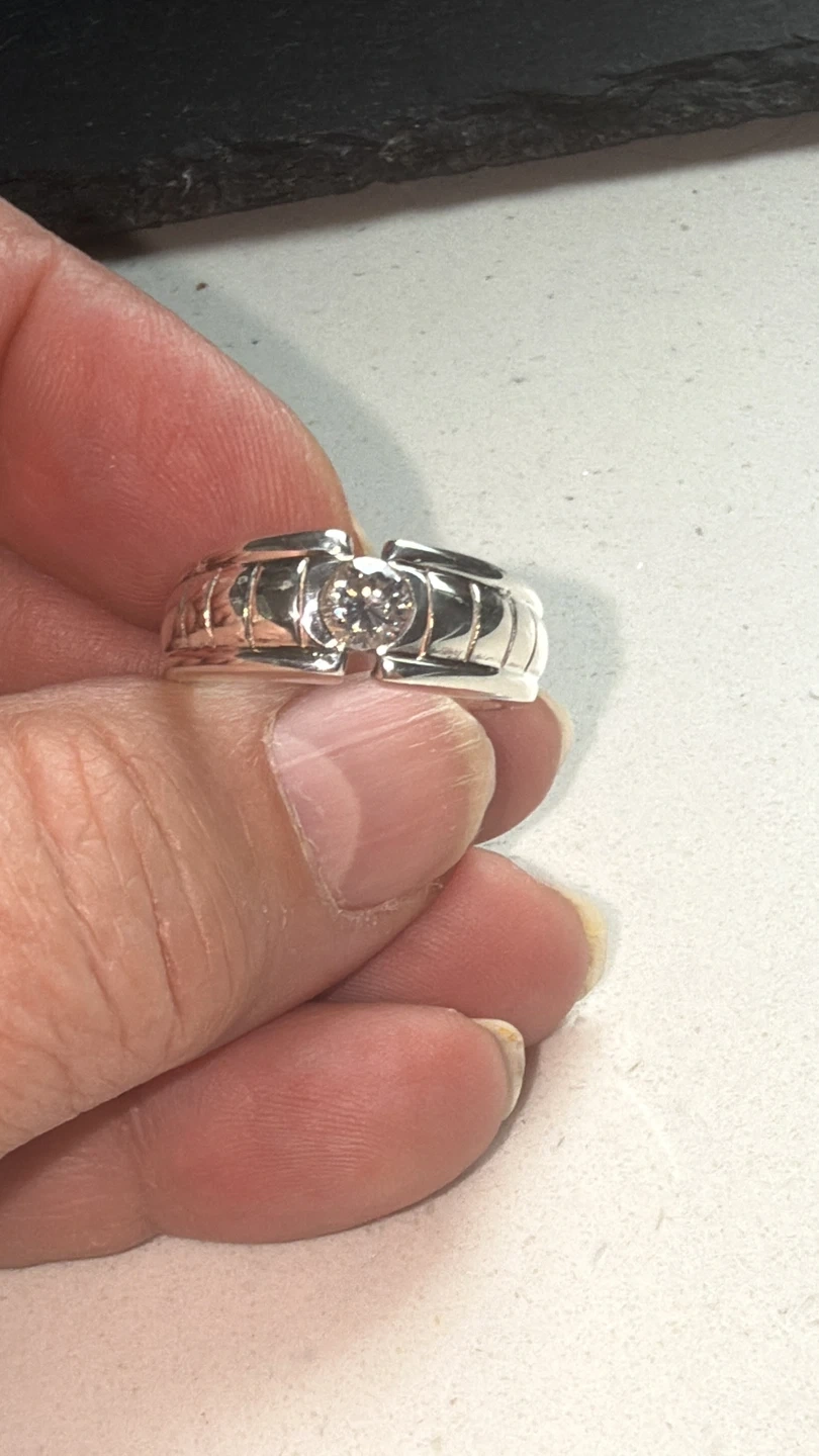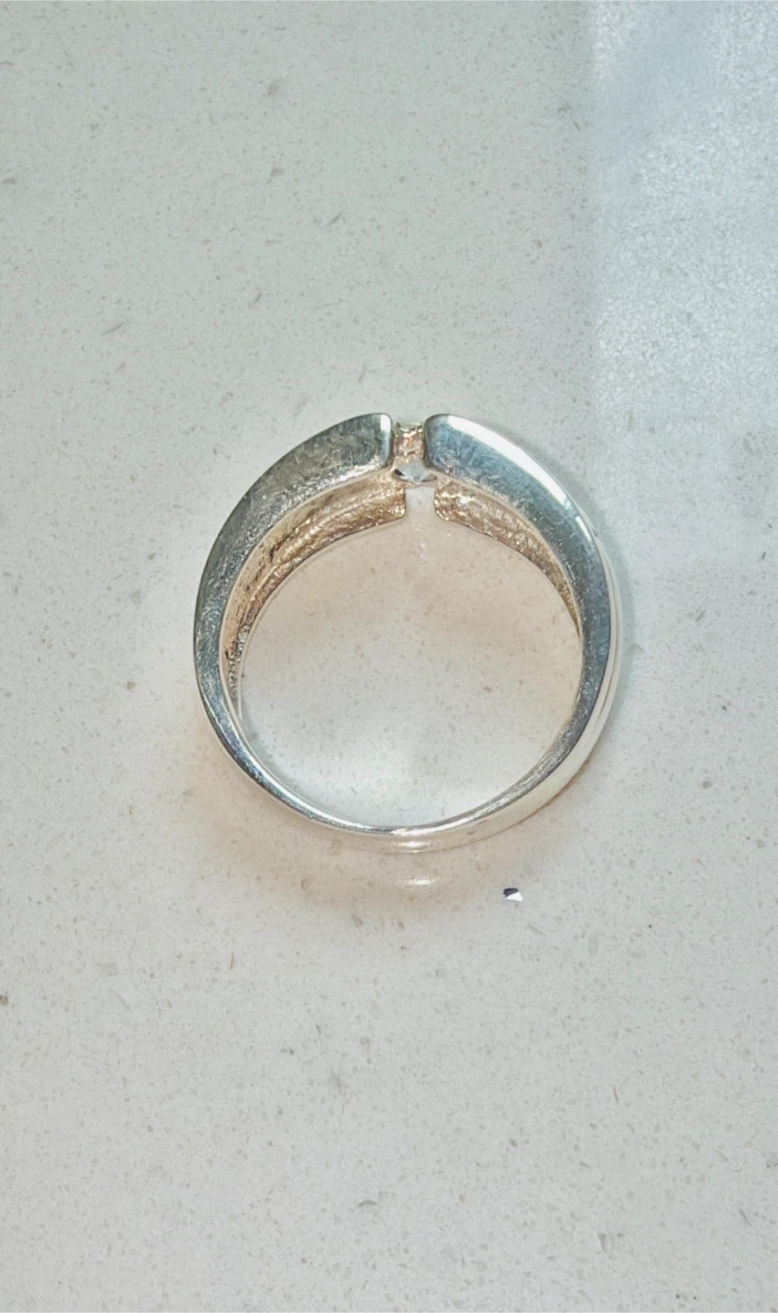 This is a stamped 925 sterling silver ring featuring a mid size Cubic Zirconia . The band has a grooved design. This ring would make a nice anniversary band.