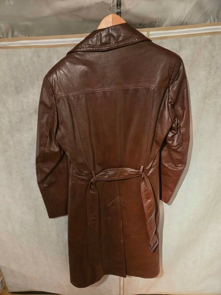 Brown leather trench coat with removable liner. All buttons and belt in good condition. Made in Canada. Size 36 (XS). Thrifted but in excellent condition. Well-maintained but it no longer fits me. From a smoke/pet-free home in the Heritage Mountain area. If the ad is up, it's still available.